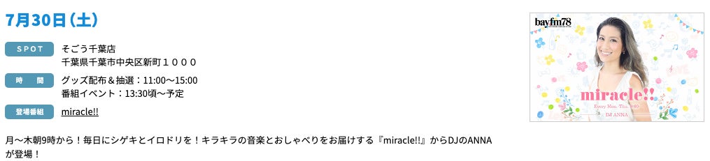 - 7月30日(土)キラキラの音楽とおしゃべりをお届けする『miracle!!』からDJのANNAが登場!