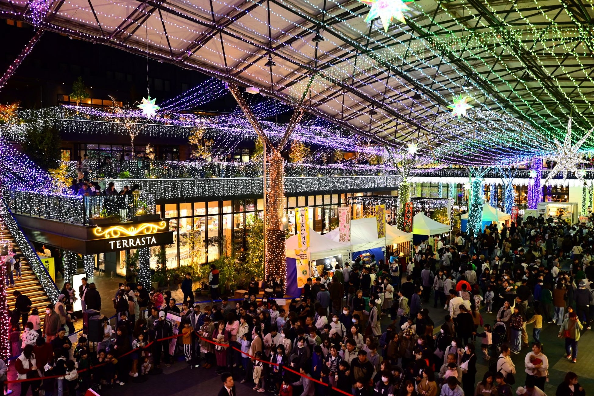 全体で約120万球の設置球数。まちなか広場には、天井に設置された大型オブジェのインパクトに加え、LEDムービングライトによる動きのある演出を追加。また、未来創造ステーションのルーバーには、演出プログラムが時間帯等で変わるイルミネーションを設置するなど、何度来ても楽しめる仕掛けづくりを展開しています。