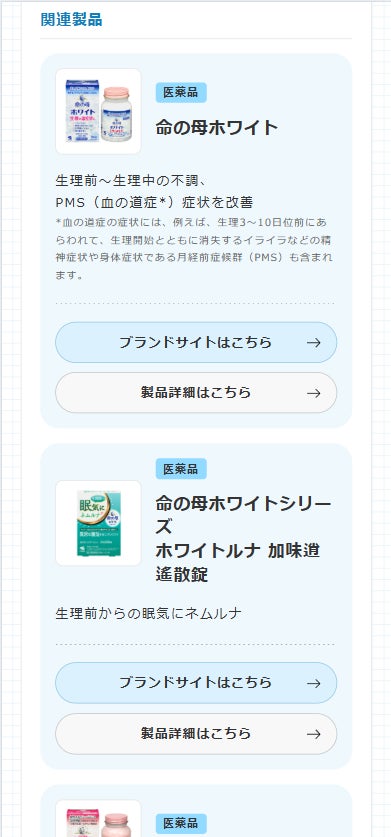 「命の母」「サラサーティ」「フェミニーナ」など、長年女性に寄り添ってきた当社の製品情報を横断的に提供し、不調に合わせた製品選びをサポートします 。これまで知らなかったケア方法や製品との出会いを通じて、より快適な生活を送るための選択肢を広げます。