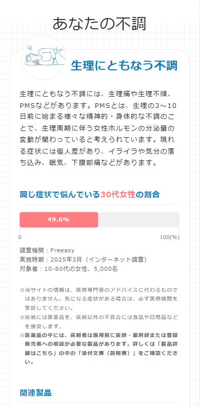 年齢や気になる不調、希望するケア方法などを入力するだけで、自分に合ったケア方法、製品の提案を受けることができます。また、不調に関する解説や、自分と同じ悩みを抱える同世代の割合も確認できます。
