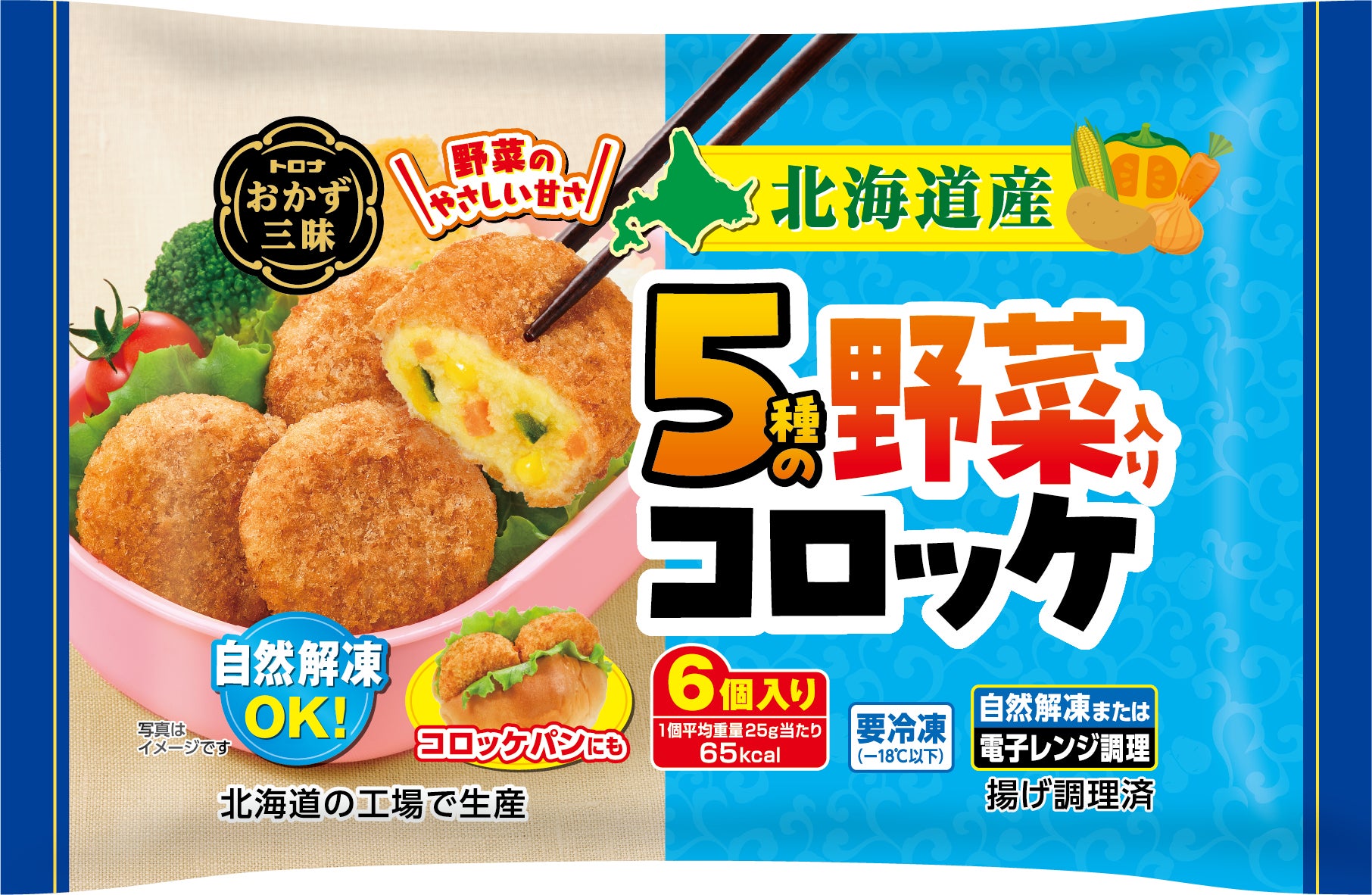 5種類の北海道産野菜(じゃがいも、かぼちゃ、玉ねぎ、とうもろこし、にんじん)を使用したコロッケです。