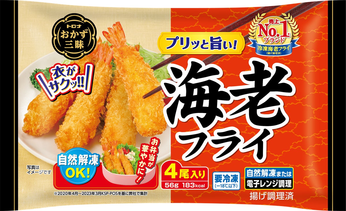 身のプリっとした食感とお弁当を華やかにするしっぽが特長。冷凍海老フライ(揚げ調理済)売上No.1※の自慢の一品です。