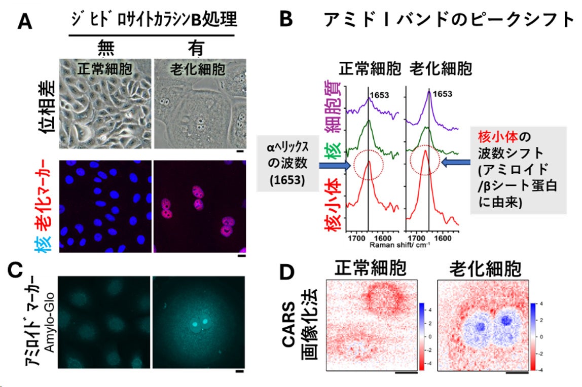 本研究では、ラマン散乱を用いた顕微画像化法により、老化細胞に含まれる小さなアミロイド凝集体中のβシートの直接可視化に成功しました。これにより細胞の老化を検出し、またその程度を評価できる高感度な方法を開発しました。この技術は同様にアミロイドに基づいた生理・病態の研究や医療開発に幅広く寄与することが期待されます。