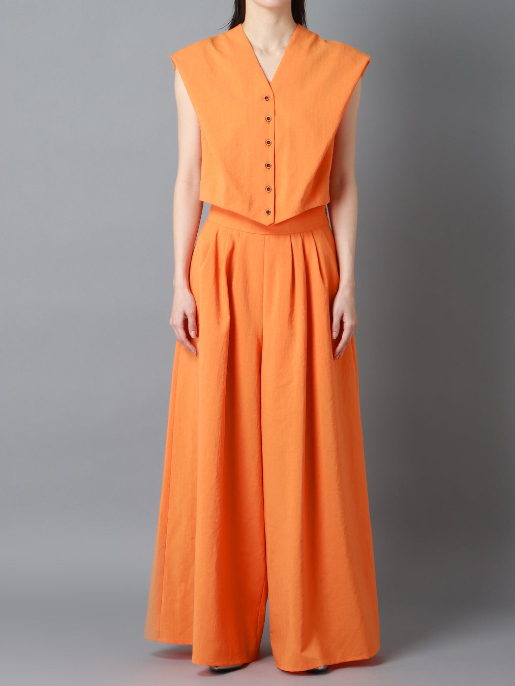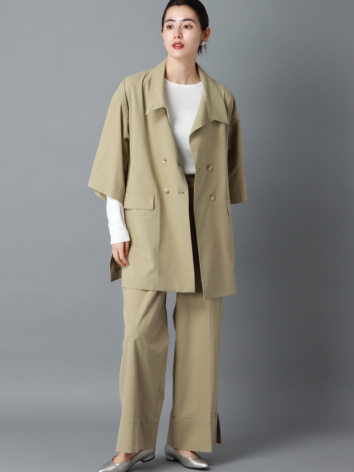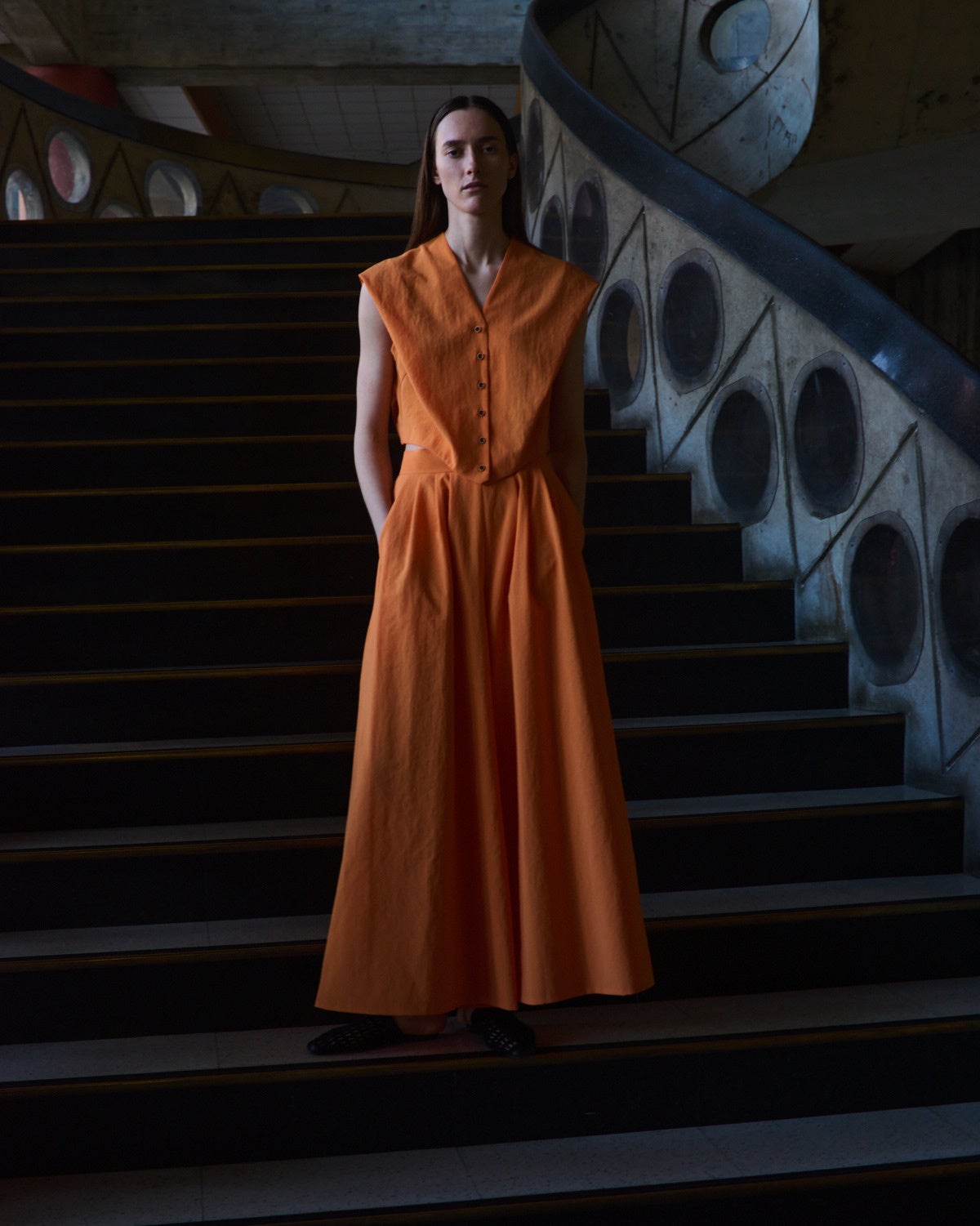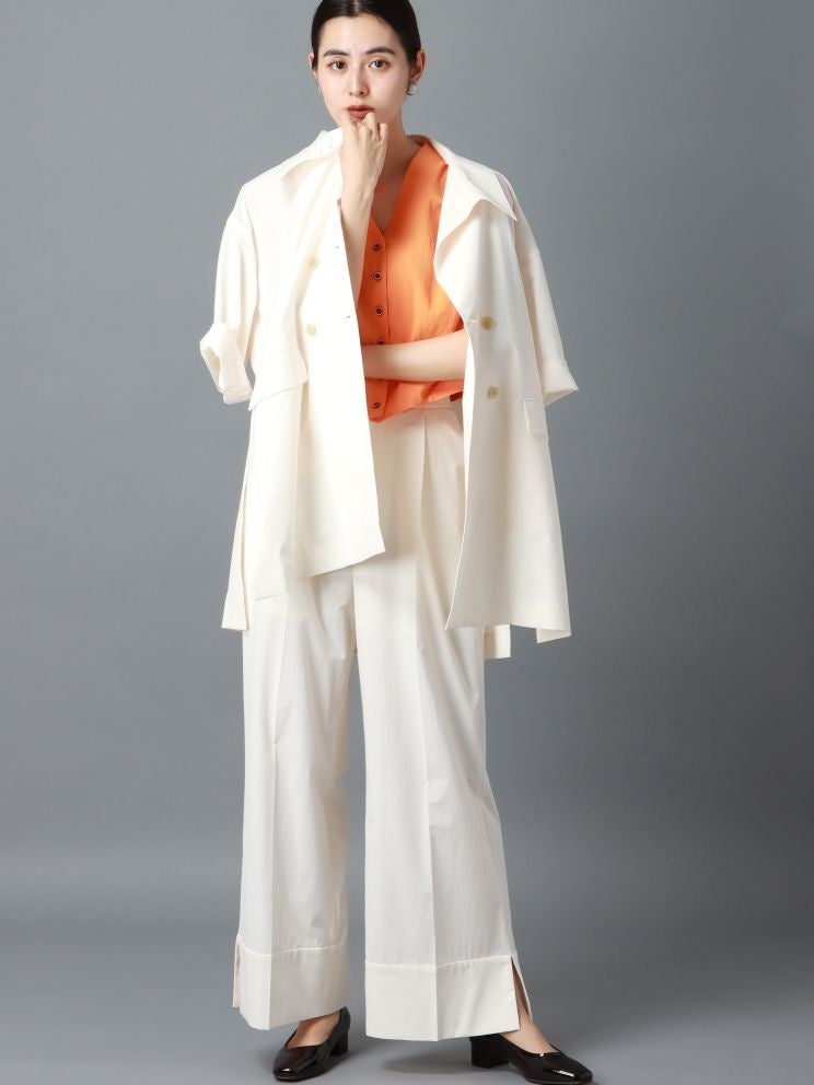 2025年春夏コレクションでは、ディレクターである黒石奈央子氏が建物の造形美からインスピレーションを受け、それを立体感や造形美として服で表現した、モードビジネスウエアを企画しています。ビジネスシーンで着られることを目的としつつも、オフスタイルでも活躍するオレンジやブルーなどの春夏らしい色味を取り入れました。今コレクションでは「スーツスクエア」の店頭と公式オンラインストアにて、第1弾を3月14日(金)から、第2弾を4月25日(金)から一般発売します。ポップアップストアでは、第2弾企画について、先行して購入することができます。