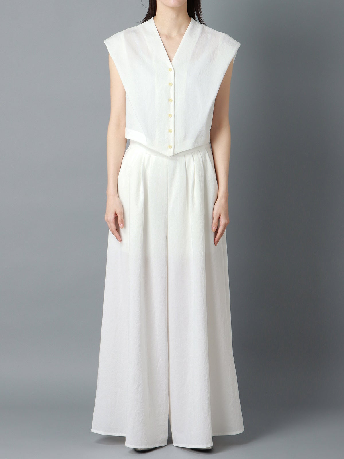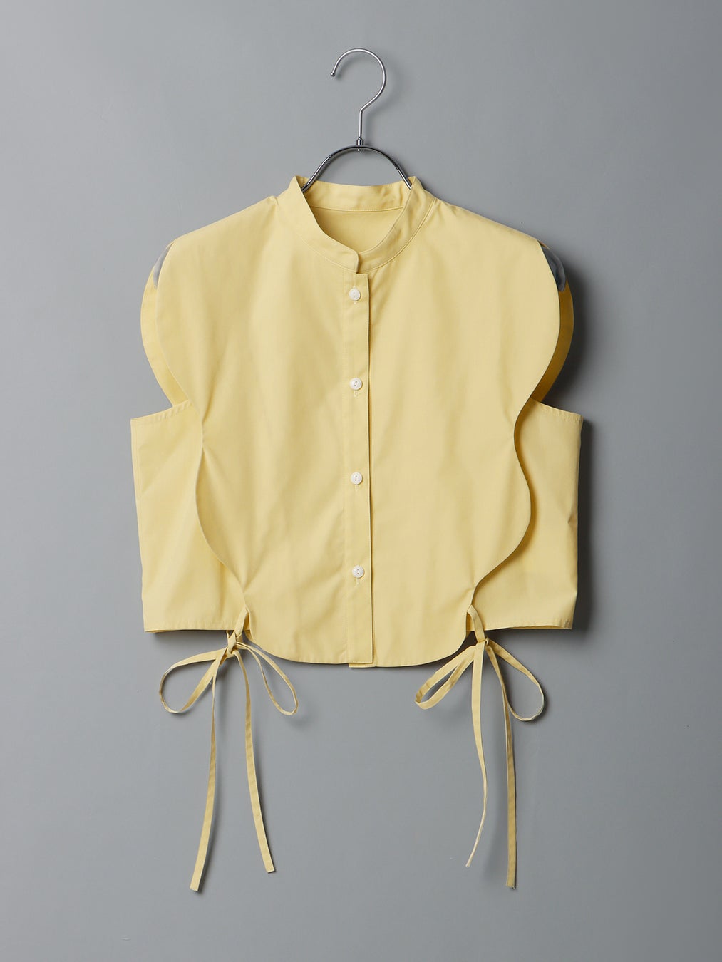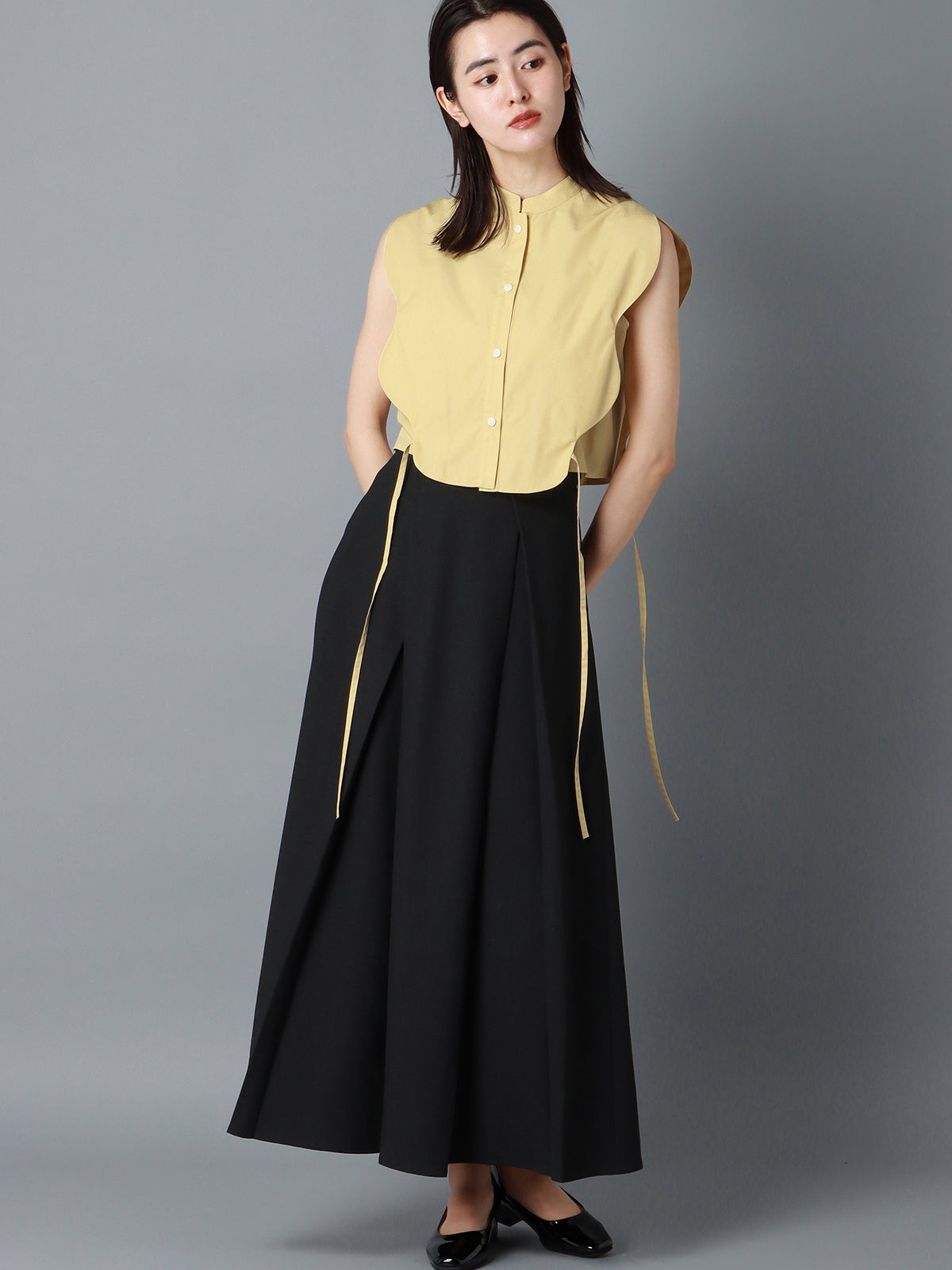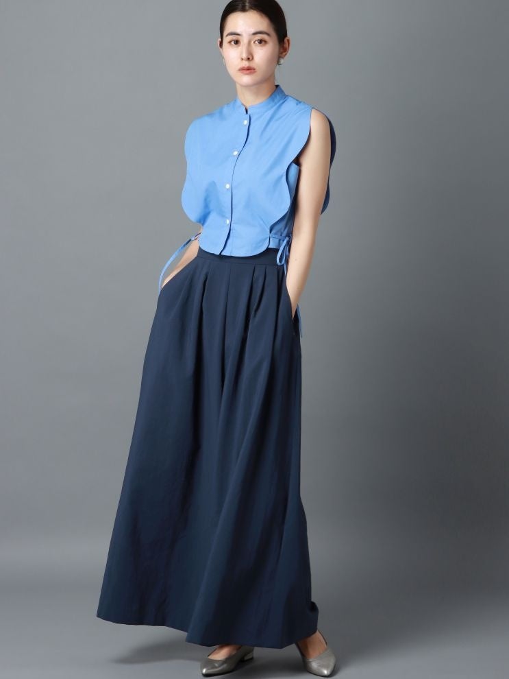 ウエスト脇のリボンは結んでもそのまま垂らしても着用可能。張りのあるシャツ生地を使用することで、フリルのようなウェーブカットでも甘すぎない着こなしを楽しめます。