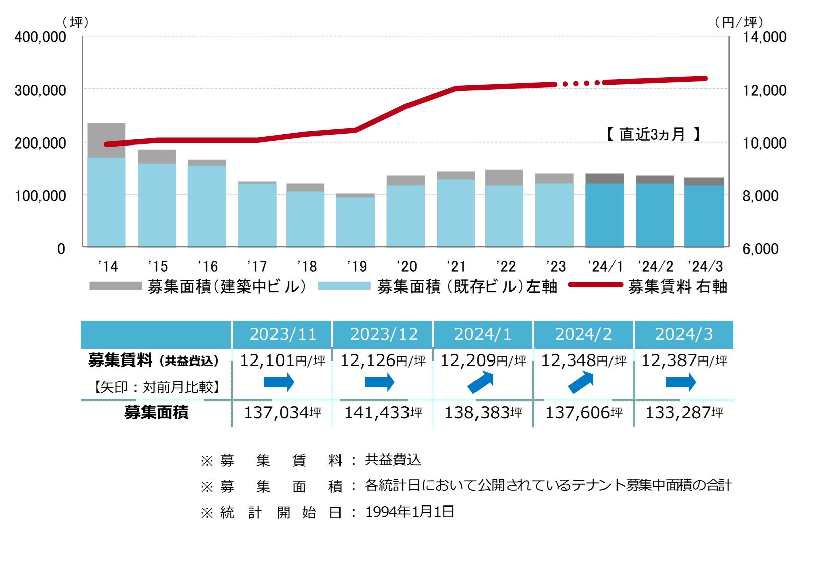 募集賃料 小幅な動きに止まる 12,000円/坪台前半で推移