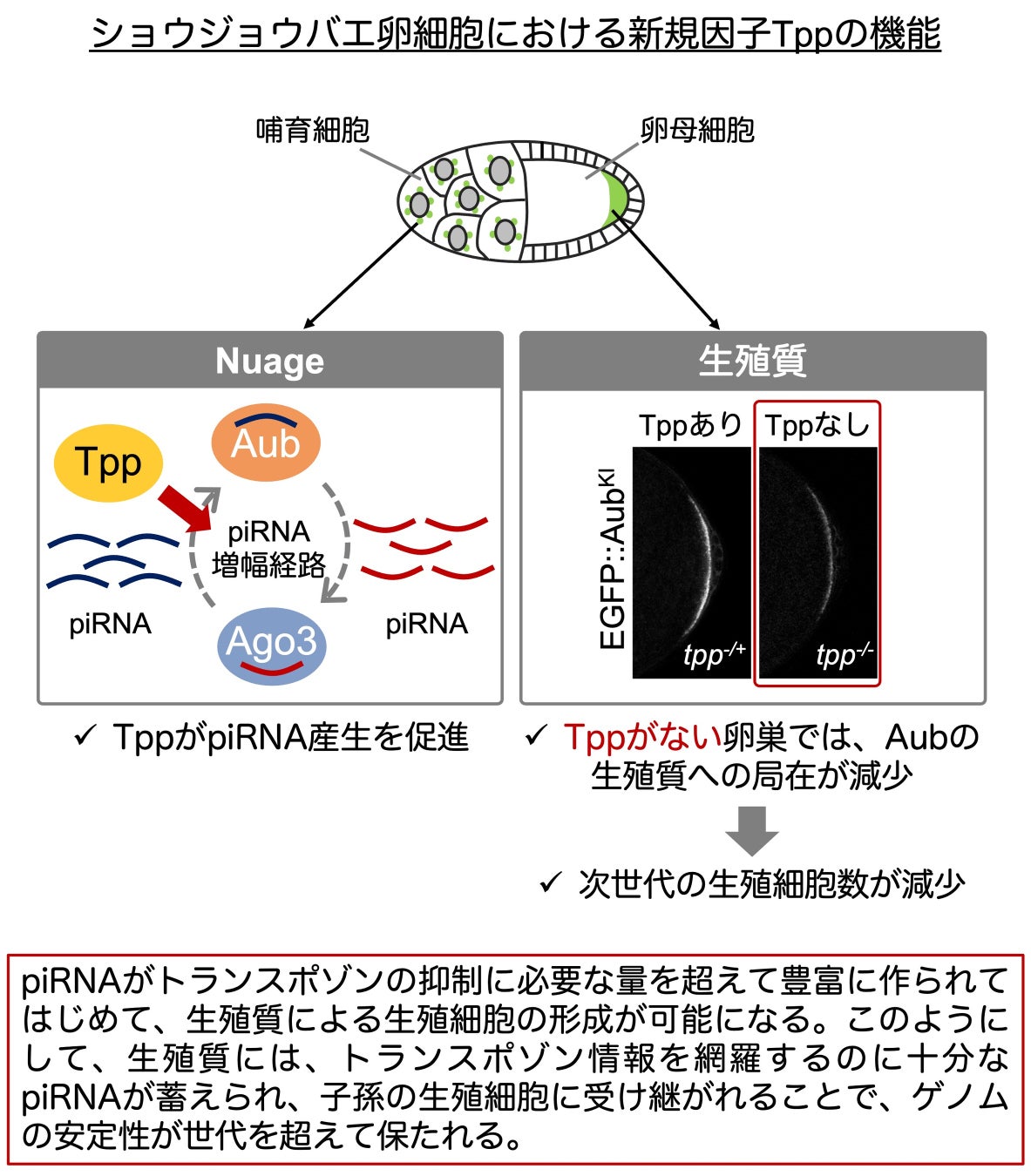 Tppを欠いた卵巣では、piRNA産生量が減少し、その結果PIWIタンパク質の1つであるAubergineタンパク質の生殖質への局在が不全となり、次世代の生殖細胞形成が阻害されることが明らかになりました。