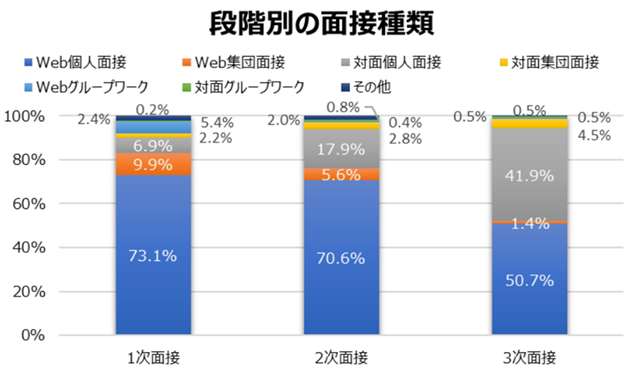 採用活動や就職活動のハイブリット化の実態を調査した、株式会社クリーク・アンド・リバー社の調査(※)によると、段階別の面接形態として、1・2次面接は70%以上がオンライン面接で占められています。