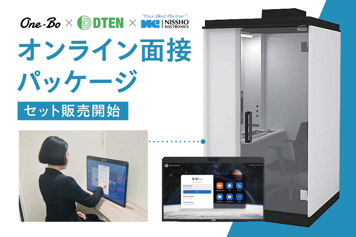 個室ブース「One-Bo」を設置している大学の関係者より、昨今の就職活動ではオンライン面接が定着している一方で、学生に対するオンライン面接用の十分な対策の提供が追いついていないという声があげられていました。そこでプラザクリエイトでは、Zoomを展開するZVC JAPAN社と、Zoom Rooms用ハードウェアを展開するDTEN、日商エレクトロニクスと連携しオンライン就活に必要なセットをまとめてご案内できるパッケージを作成しました。
