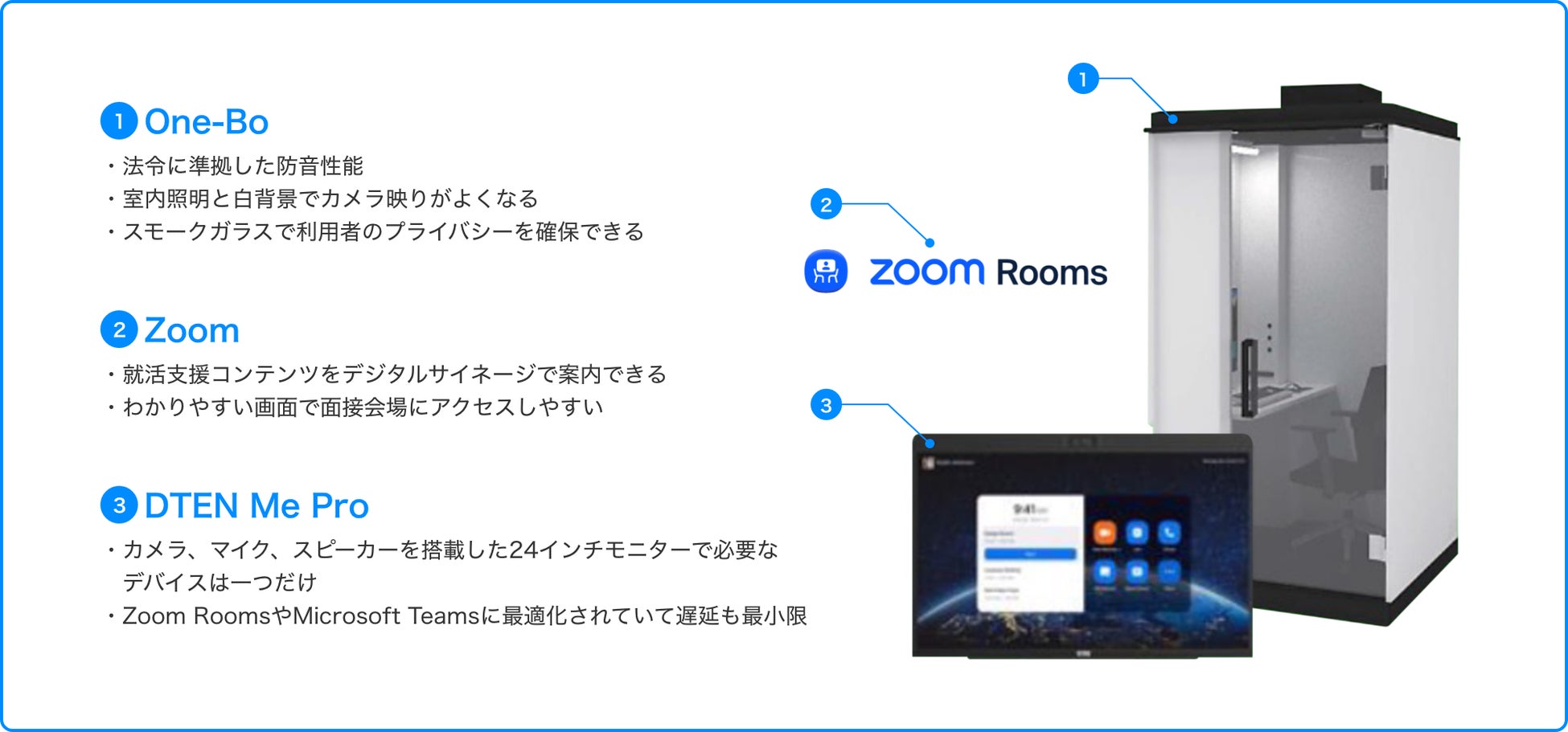 オンライン面接パッケージとは、オンライン化している就活活動を、効率的に支援するための環境(個室スペース、システム、デバイス)がセットになったパッケージです。個室ブース「One-Bo」は、法令に準拠した防音性能・鮮明なカメラ映り、スモークガラスでプライバシーの確保を提供します。One-Bo内では、ビデオ会議システム「Zoom」をカメラ、マイク、スピーカーを搭載したオールインワンタッチパネルディスプレイ「DTEN Me Pro」を設置し、身一つでオンライン面接に臨めます。