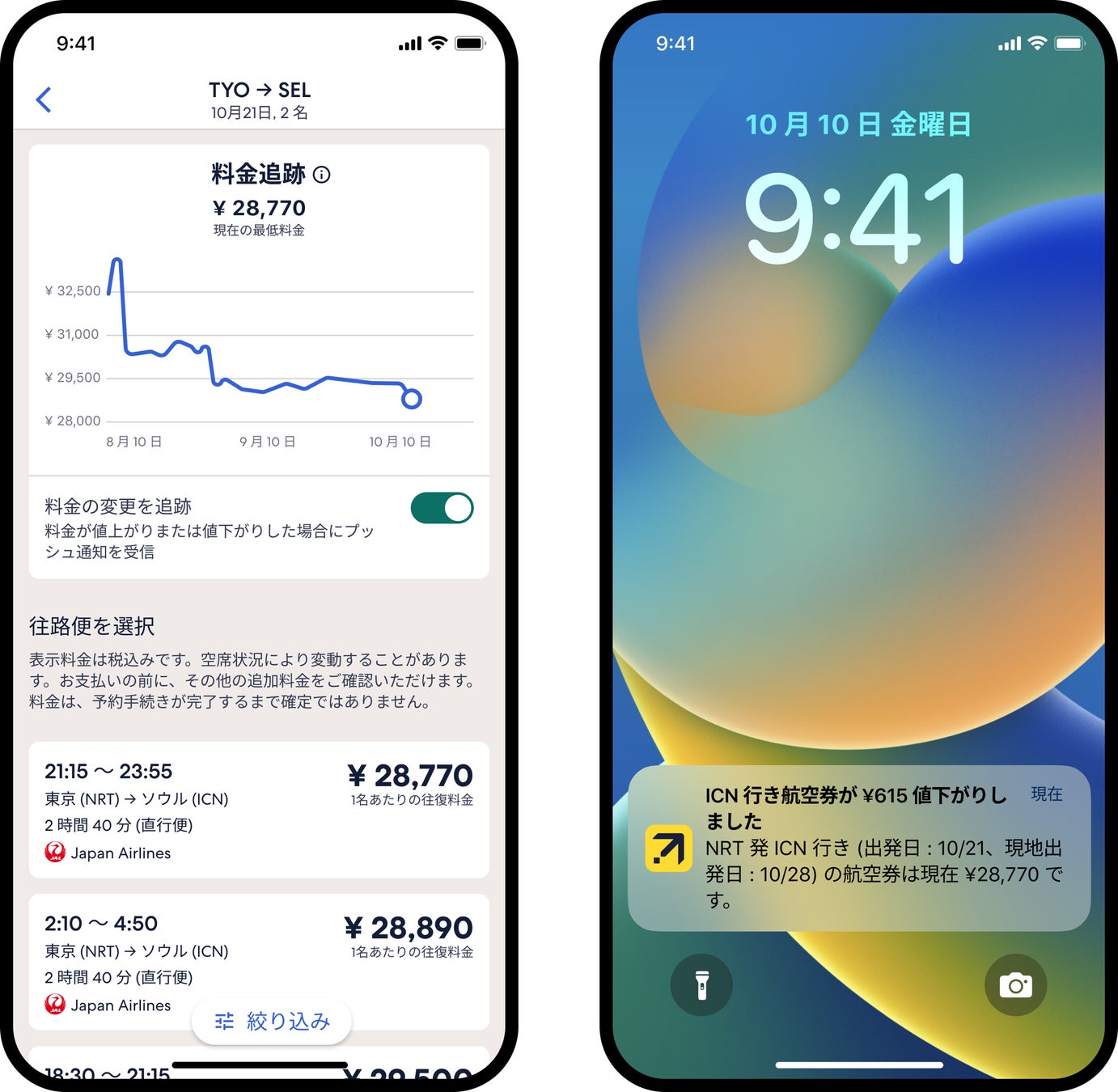 エクスペディアのアプリでは、AIと機械学習機能を活用し、旅行者が検索しているルートの航空券の価格が上下した際にアプリ上でプッシュ通知を送信します。これにより、常に航空券の価格をチェックする必要がなくなり、お得だと思うタイミングで予約をすることができます。