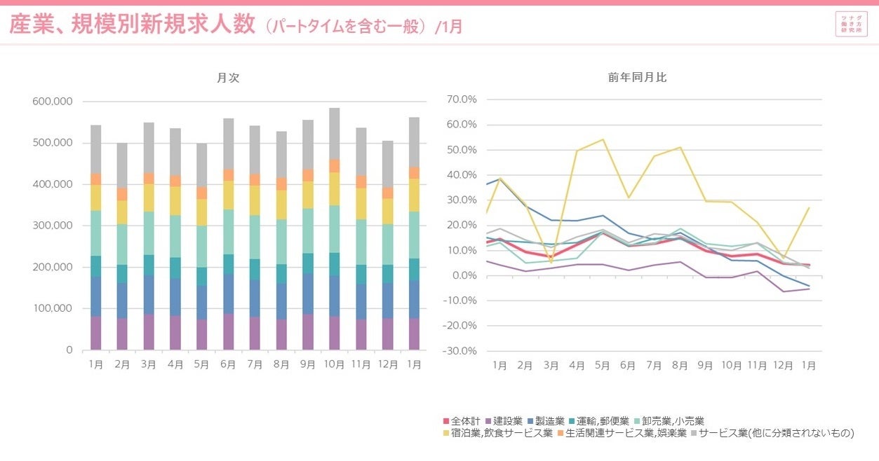 新規求人数は、前年同月比+4.2%と前月(+4.8%)の伸びよりやや鈍化しました。伸び率トップ3は宿泊業,飲食サービス業(+27.0%)、運輸業,郵便業(+4.0%)、卸売業,小売業(+3.8%)となりました。一方で伸び率ワースト3は情報通信業(-7.3%)、建設業(-5.4%)、製造業(-4.0%)と、伸び率が前年同月を下回る産業が増加しています。