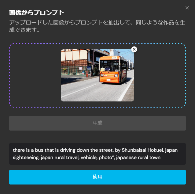 画像を読み込んで、プロンプトを作成できる機能です。AI画像生成のプロンプトが思いつかない時も、画像一枚で説明文のアイデアを見つけることが可能です。