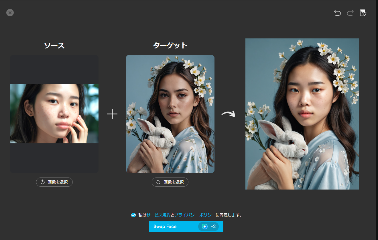 当てはめたい人物の写真を「ソース」としてアップロードし、顔を入れ替えたい画像を「ターゲット」として選択します。