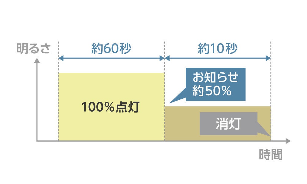 自動消灯の約10秒前に約50%の明るさに減光してお知らせします。この10秒の間にセンサーが反応した場合は、すぐに100%点灯へ戻ります。