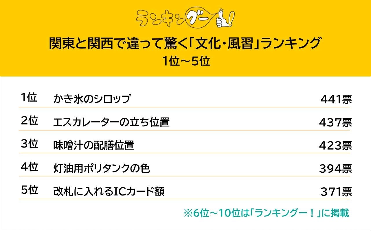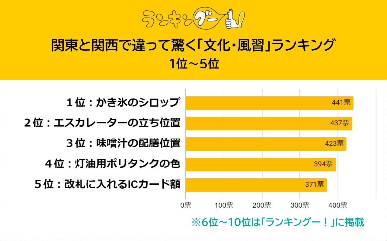 2位は関東では左、関西では右という暗黙のルールがある「エスカレーターの立ち位置」。3位は関東では右手前に、関西では左奥になる「味噌汁の配膳位置」。4位は関東では赤、関西では青が主流となる「灯油用ポリタンクの色」。5位は関東では初乗り運賃分、関西では1円だけあれば入場可能となる「改札に入れるICカード額」となりました。