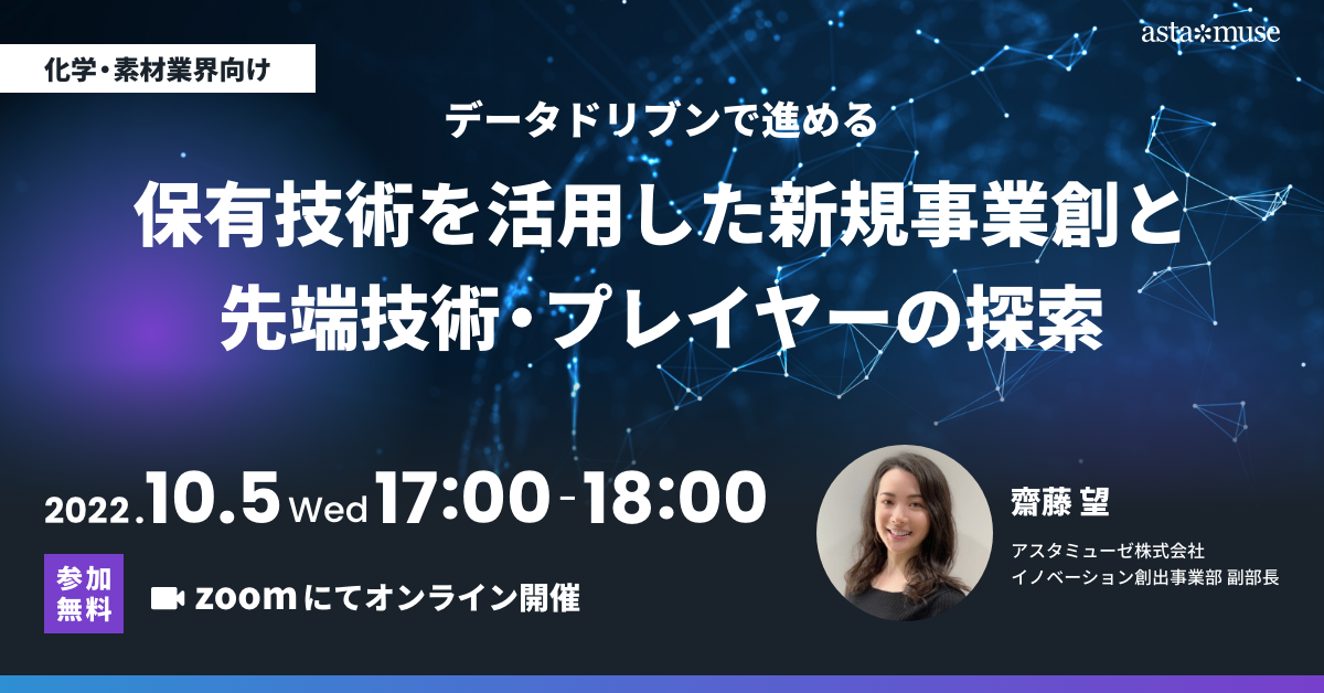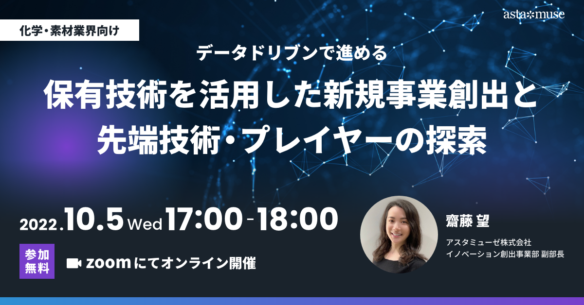 【無料ウェビナー開催!】「データドリブンで進める保有技術を活用した新規事業創出/先端技術・プレイヤーの探索~化学・素材業界向け~」10月5日(水)17時~