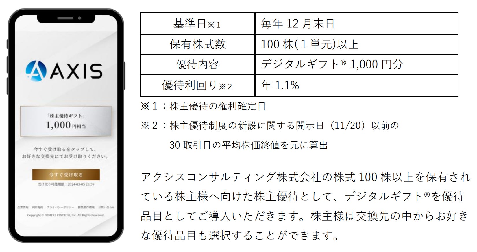 アクシスコンサルティング株式会社(代表取締役社長COO:伊藤 文隆、東証グロース市場:証券コード9344)において、株式会社デジタルプラス(代表取締役社長:菊池 誠晃、本社:東京都渋谷区、東証グロース市場:証券コード3691)グループが運営する「デジタルギフト®」を株主優待としてご活用いただくことになりました。