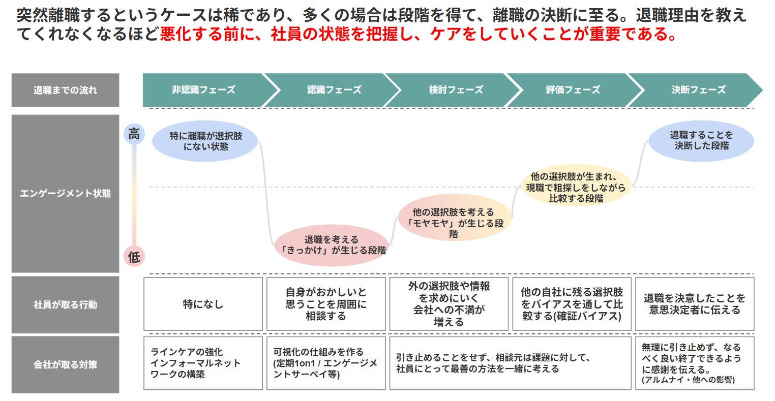 実は突然離職するというケースは稀であり、多くの場合は段階を経て離職という決断に至ります。以下の図にもある通り退職者の中できっかけやモヤモヤが生じたタイミングで早期に社員の状態を把握し、ケアができるかというところが離職や休職の防止の鍵になります。