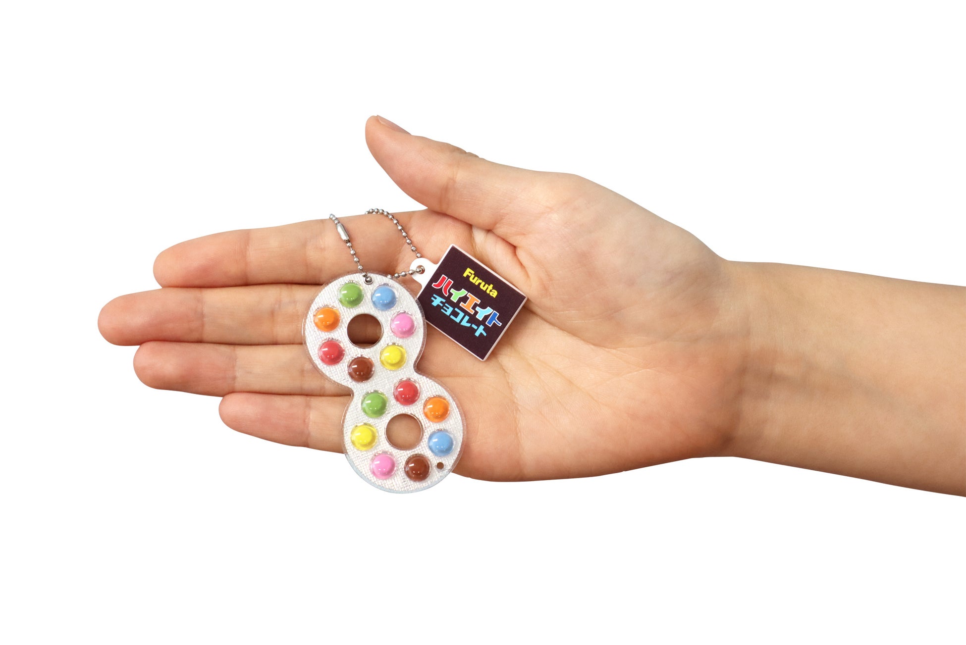 さらに「ハイエイトチョコレート」には実際の商品同様の“穴”が開いており、紐やゴムを通して手持ちのぬいぐるみなどに装着して“即席フルタマン”として遊ぶこともできます。また「フルタマン」のアクリルキーホルダーは、身に付けるだけでなく、お菓子と一緒に撮影したり“オモ写”撮影(おもちゃを使った撮影)などでも楽しむことができます。