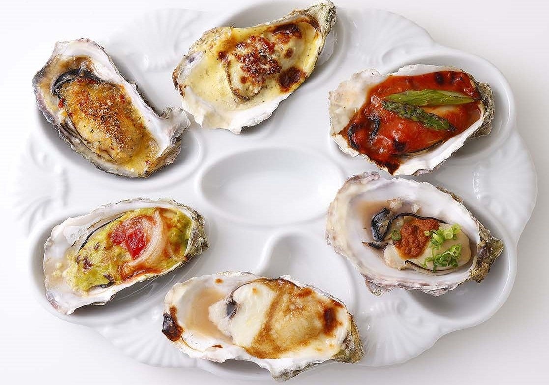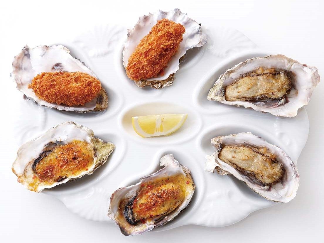 (素焼き、焼牡蠣2種、牡蠣の唐揚げ、カキフライ、揚げ出し)