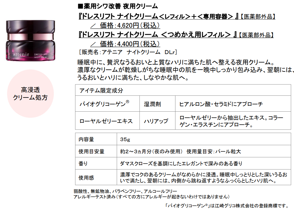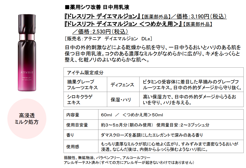 アテニアのスキンケアは、独自の“時計美容理論*5”に基づき、朝のスキンケアでは、化粧水の後、日中の外的ダメージから肌を守りながら美肌へと導く成分を配合した「日中用乳液」の使用を、夜のスキンケアでは、夜に必要な美容成分を配合した「夜用クリーム」の使用を推奨しています。