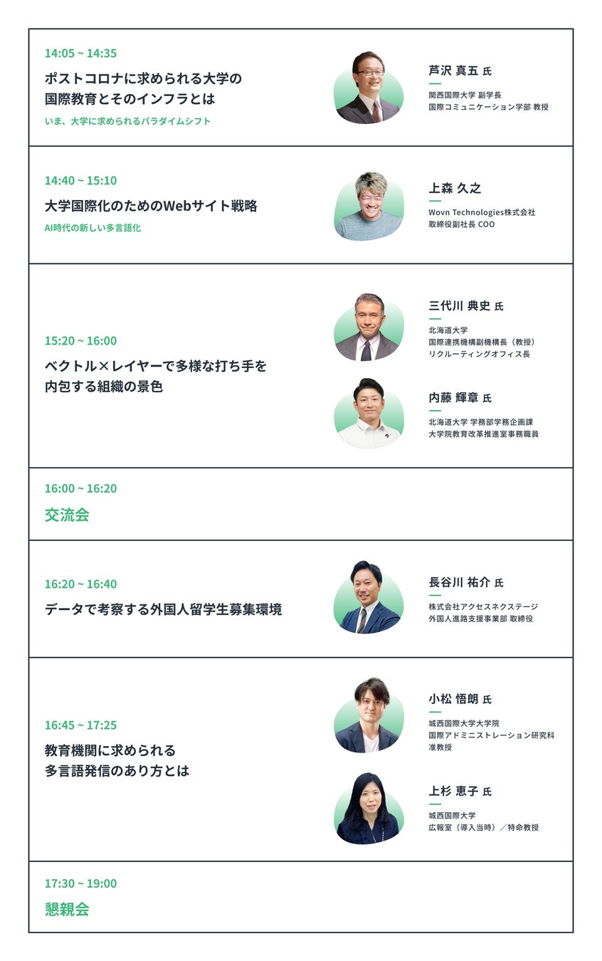 また、大学 Web サイトを活用した留学生獲得戦略・施策事例として、北海道大学、城西国際大学によるセッションをご用意するとともに、大学 Web サイトの多言語化を支援してきた WOVN より“多言語化テクノロジーの活用事例”をご紹介します。