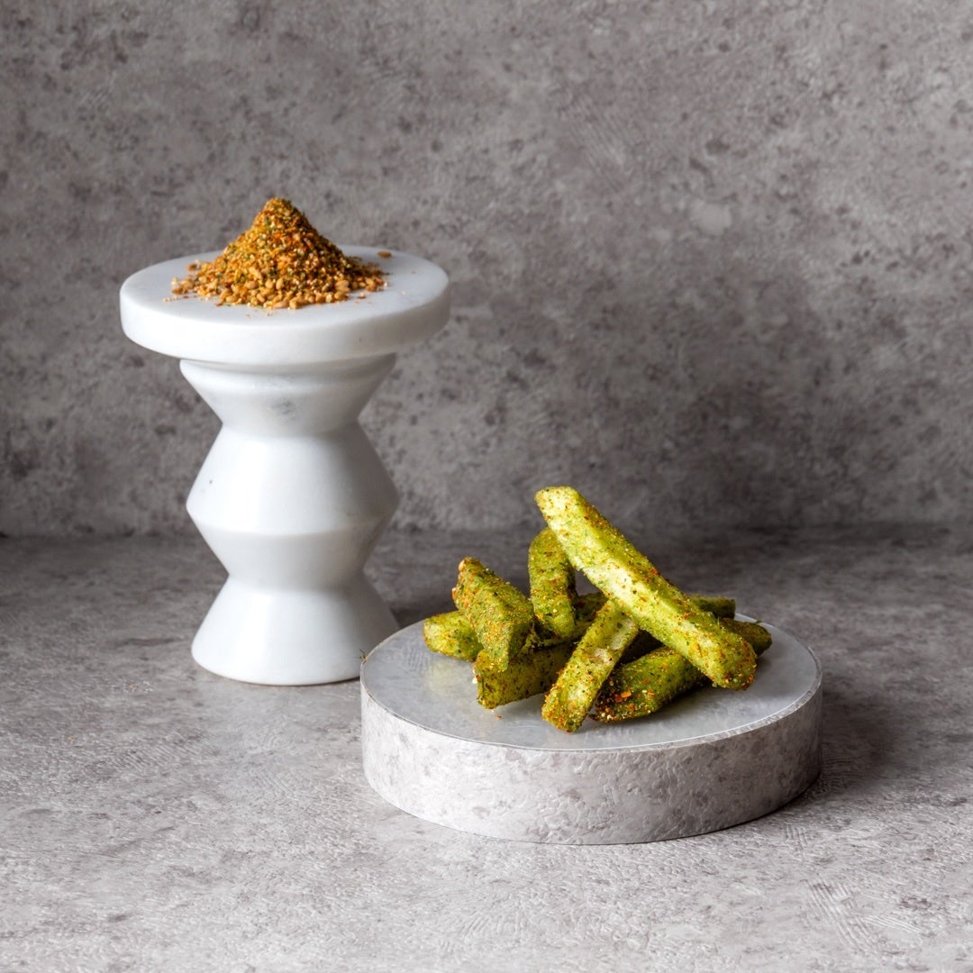 ぶぶるで人気のお土産、茶葉を振りかけたポテトスナック「ぽてと」に、「柚子七味」や「ぶどう山椒」のスパイスをミックス。