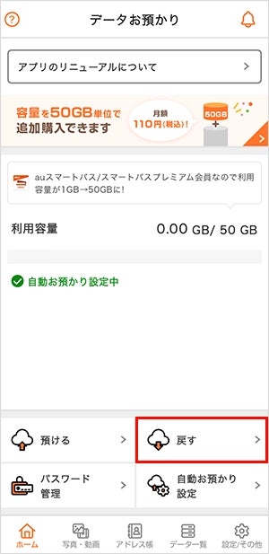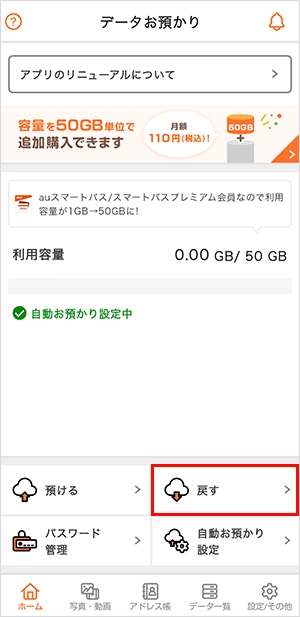 ステップ2、事前にバックアップを取っている場合、ホーム画面の右下にある「戻す」をタップします。