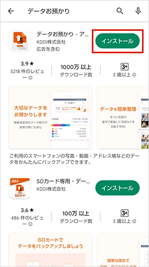 ステップ1、Google Playストアで「データお預かり」で検索し、アプリをインストールします。初回の場合はアクセス許可などが要求されます。指示に従って次へと進みます。