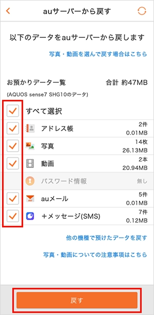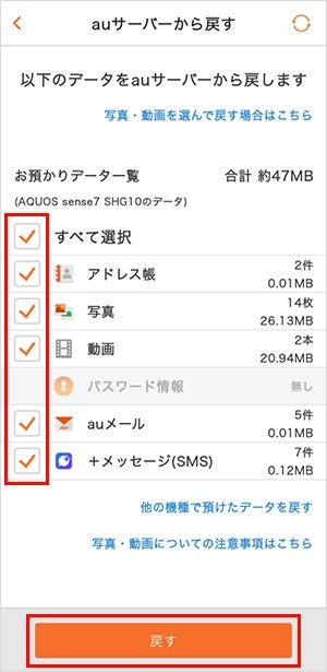 ステップ3、復元したいデータ種類を選択し、「戻す」をタップします。
