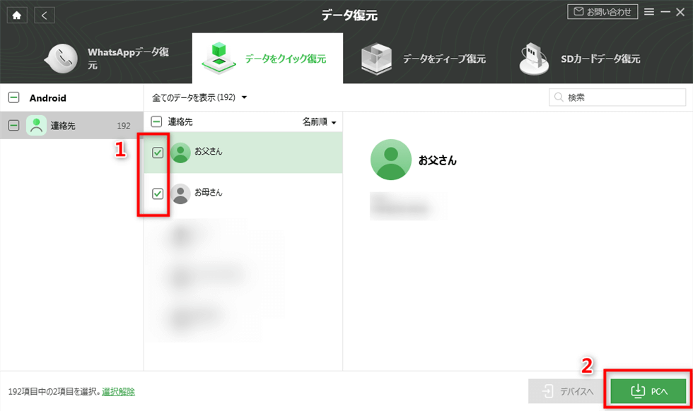 ステップ3、復元できる連絡先がプレビューされ、その中から復元したいのをチェックし、スマホやパソコンに復元します。