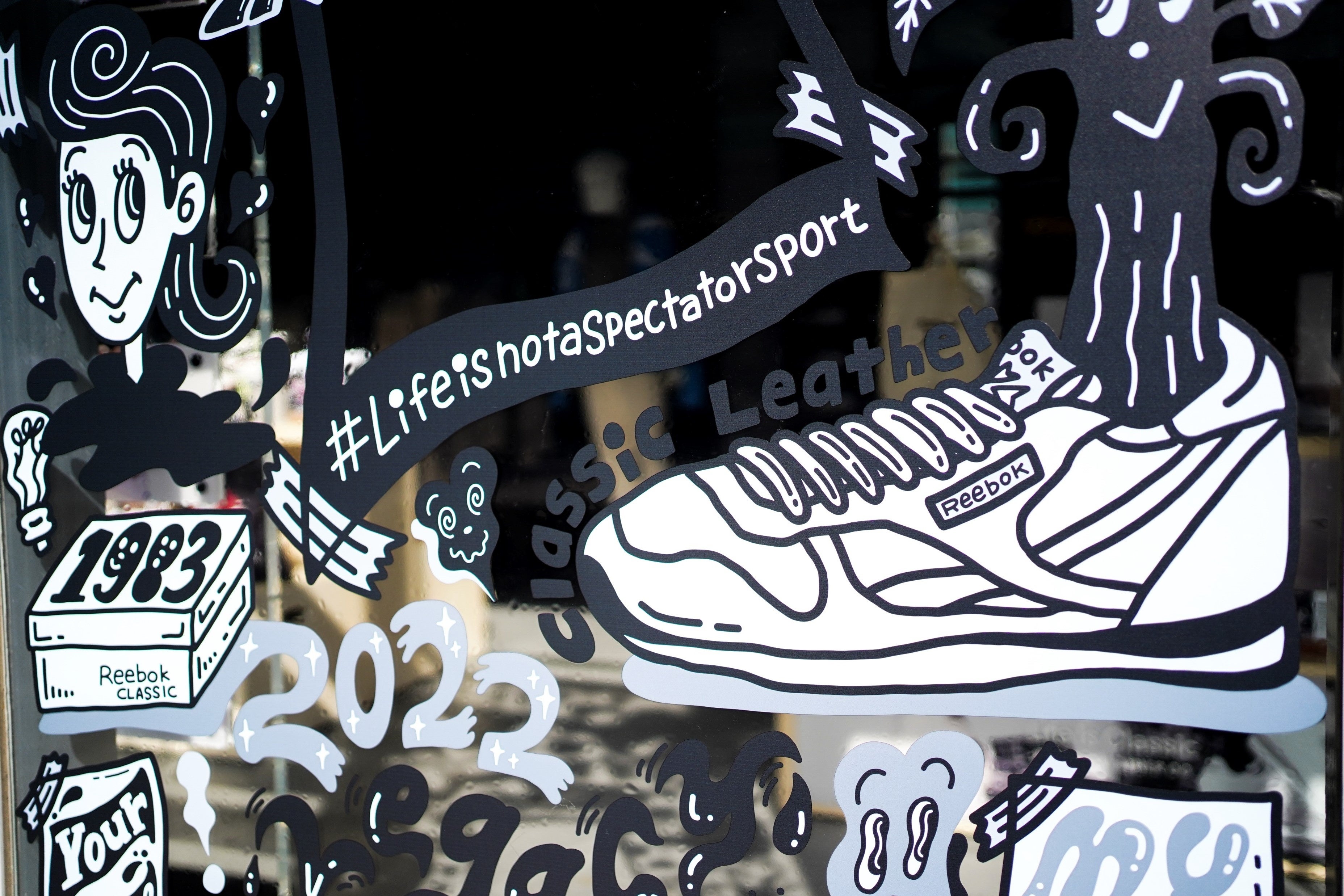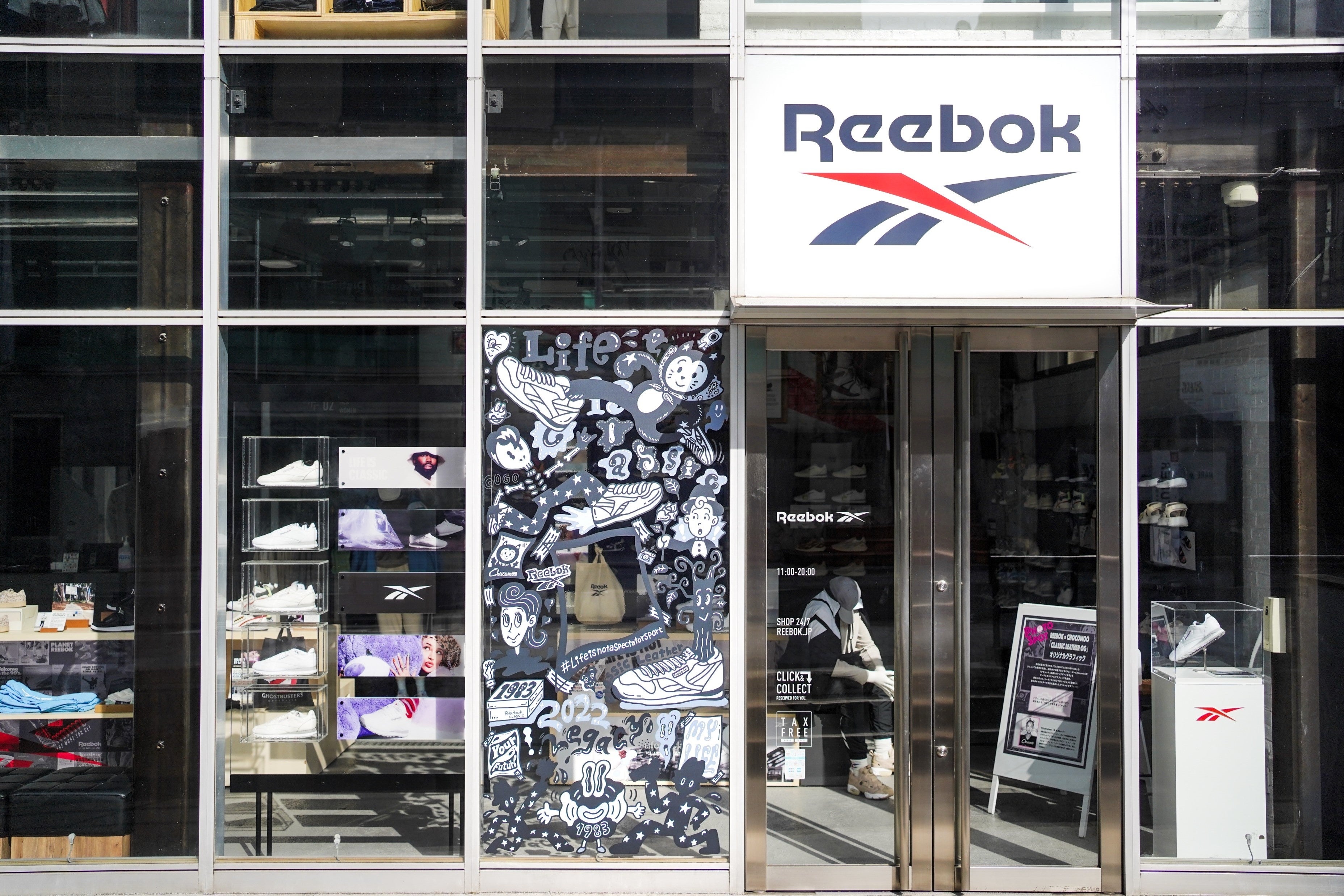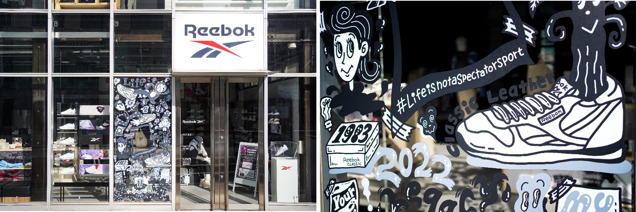 新ブランドキャンペーン「Life is Not a Spectator Sport ~人生を、動いて、動かせ~」では、スポーツにルーツを持つアスレチックライフスタイルブランドとしてのリーボックの原点に立ち戻り、観客席に留まるのではなく、自ら動き、参加し、人生を動かす“当事者”になることの大切さを発信していきます。今年2月には、世界的に活躍するアスリートやアーティストを複数名起用し、キャンペーンのメッセージを伝えるブランドフィルムを公開しました。今回日本では、人気のイラストレーターやアーティスト集団とコラボレーションをし、リーボック クラシックストア 原宿店のファサードにブランドのアイコニックモデルをモチーフにしたウォールアートを、全4回にわたり展開してまいります。