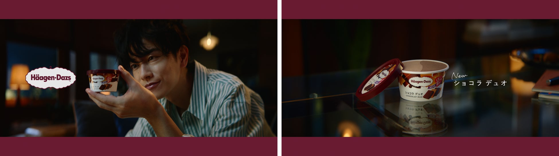カカオの香り豊かな「カカオショコラ」と、コク深い「ミルクショコラ」。1つで2種類のショコラアイスクリームが味わえる新商品、ハーゲンダッツ ミニカップ『ショコラ デュオ』。「本気ショコラは、2度おいしい。」というナレーションとともに、佐藤さんが満足して思わずソファにもたれてしまう様子を通して、その本格的な味わいを伝えます。