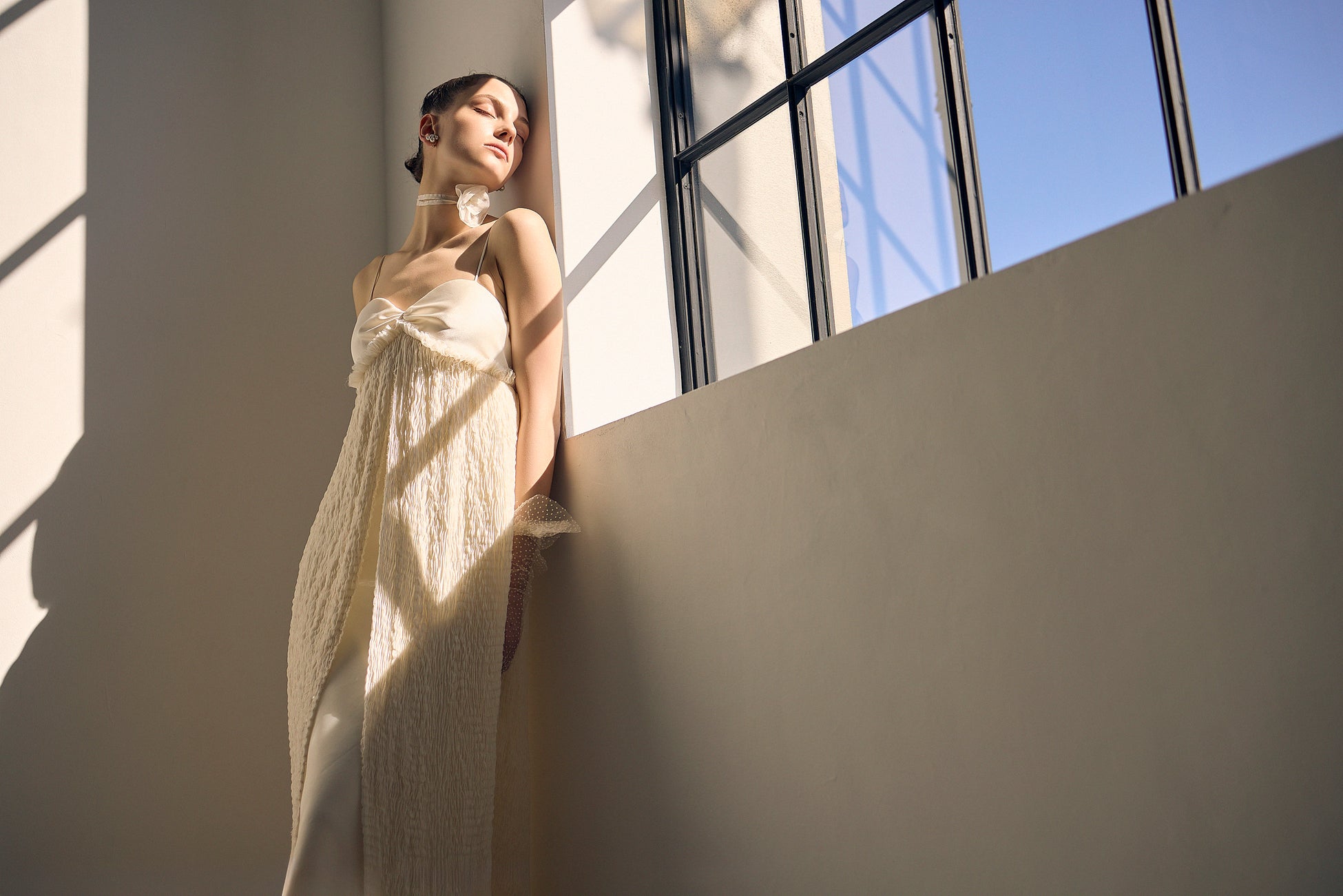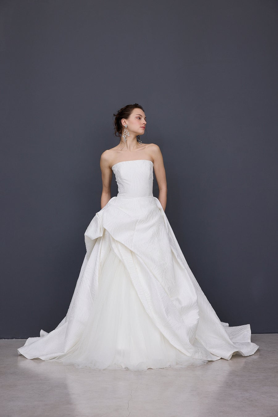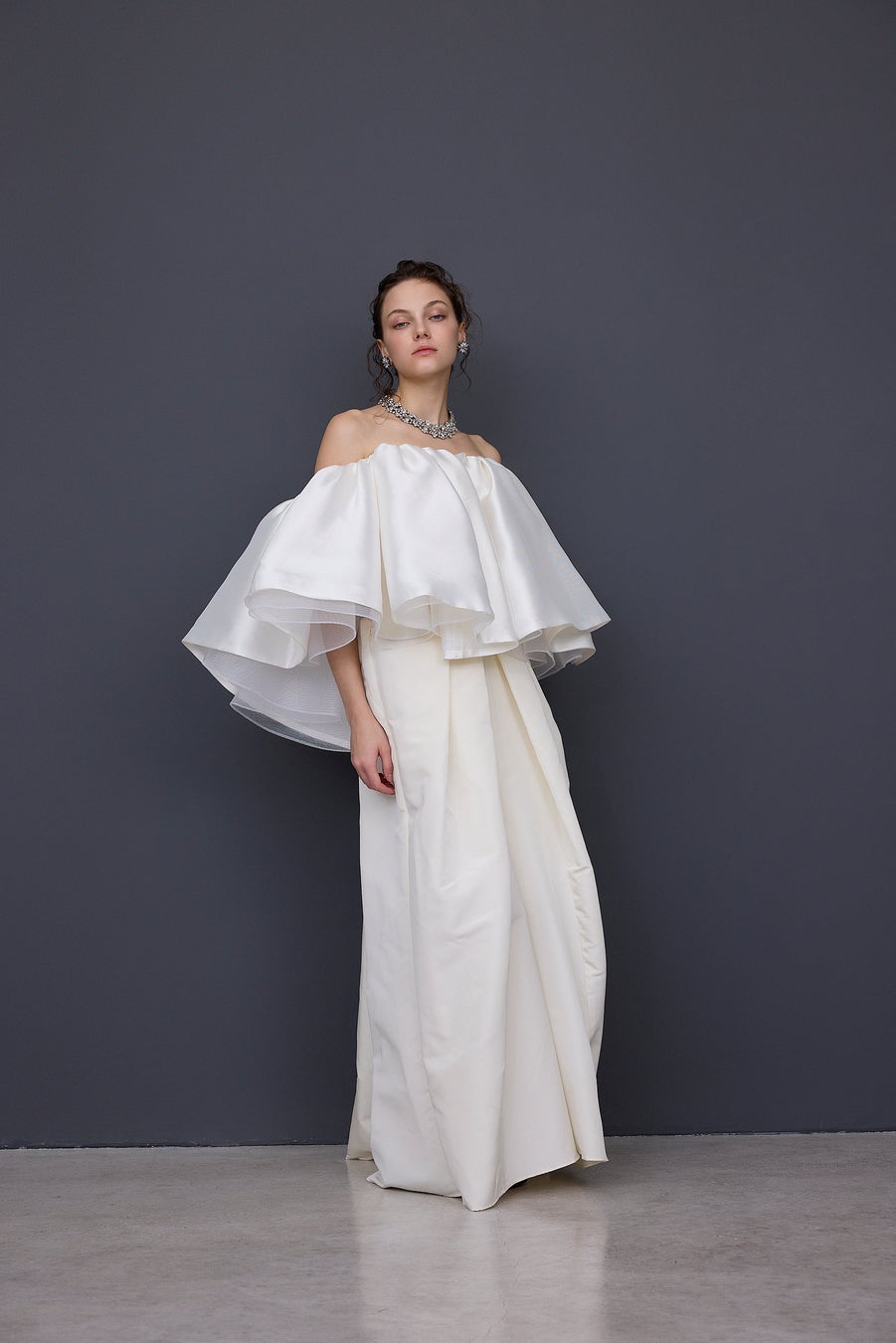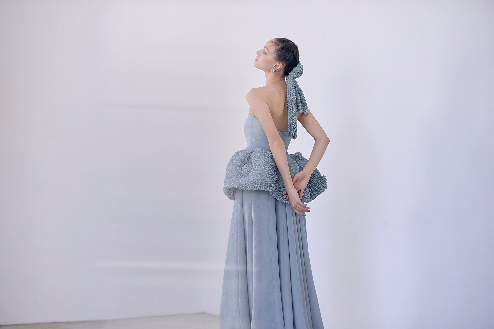 初のパンツスタイルで、光沢あるドレスのスカート生地を胸元にたっぷりとあしらったオフショルダードレス、マーメイドラインのドレスに別のドレスのシアー素材のボレロを組み合わせた、肩回りの柔らかな装飾が儚げなロングスリーブドレス、ドレス3着分のワッフル生地を贅沢に使用し、フェミニンな大きな袖と大胆な背面のカッティングのギャップが印象的なパフスリーブのドレス、ジャガード織りの布地の表情を活かし、たくし上げたような立体的なスカートから柔らかなチュールが覗くビスチェドレスの計4型をご用意しました。