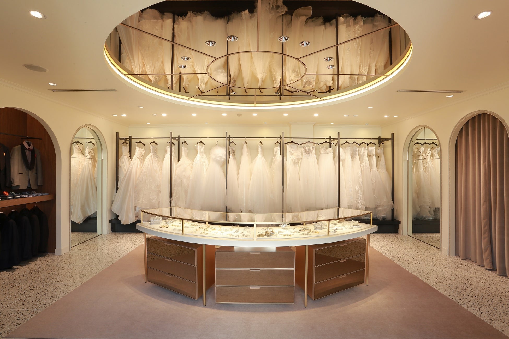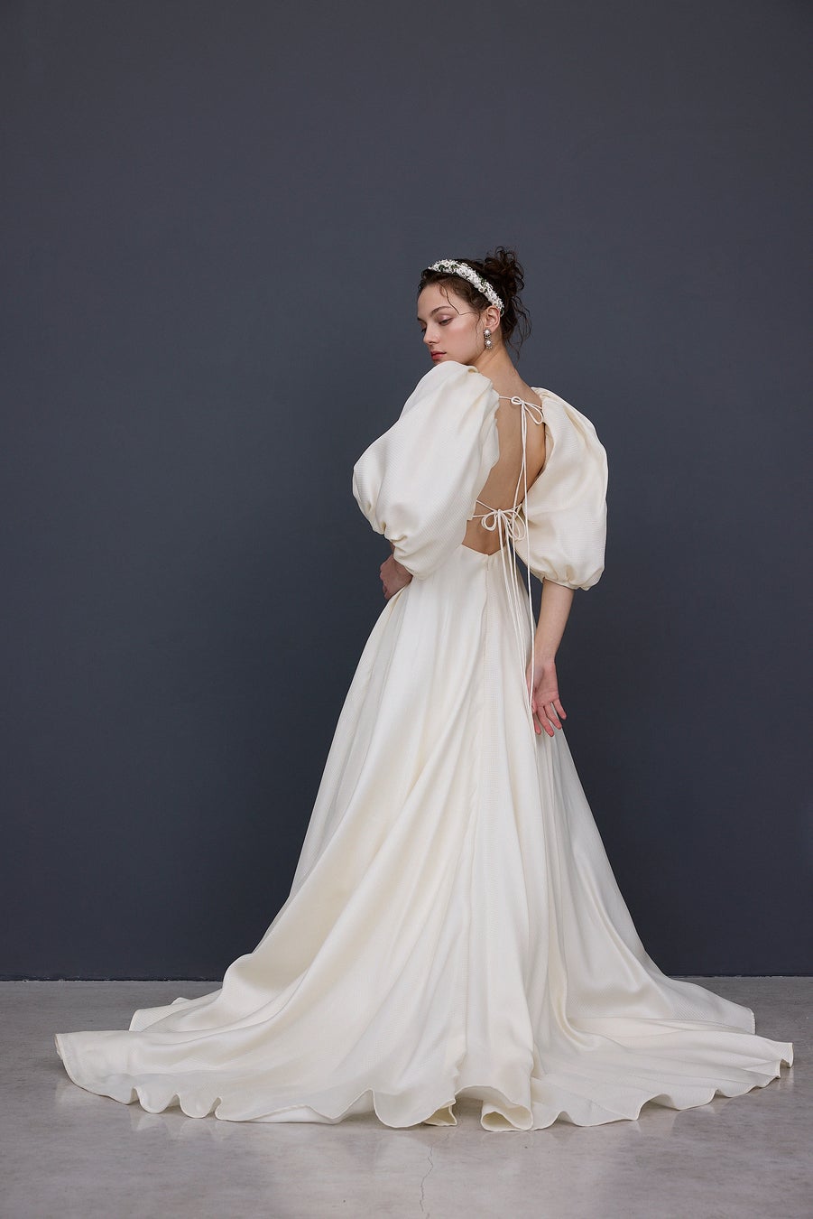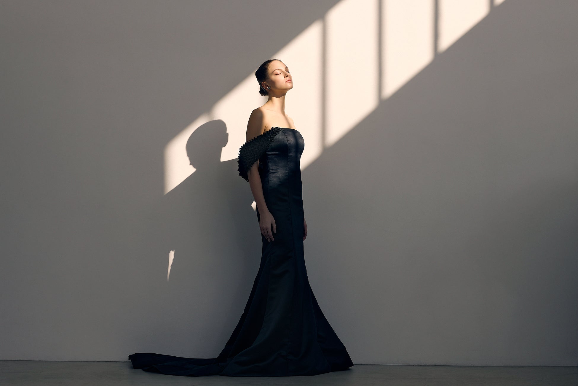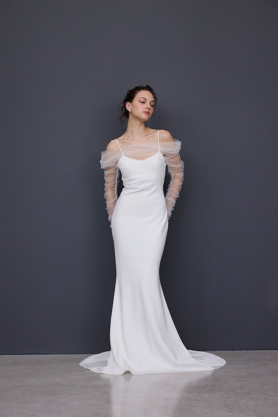 初のパンツスタイルで、光沢あるドレスのスカート生地を胸元にたっぷりとあしらったオフショルダードレス、マーメイドラインのドレスに別のドレスのシアー素材のボレロを組み合わせた、肩回りの柔らかな装飾が儚げなロングスリーブドレス、ドレス3着分のワッフル生地を贅沢に使用し、フェミニンな大きな袖と大胆な背面のカッティングのギャップが印象的なパフスリーブのドレス、ジャガード織りの布地の表情を活かし、たくし上げたような立体的なスカートから柔らかなチュールが覗くビスチェドレスの計4型をご用意しました。
