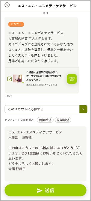 ・スカウト機能:求職者のプロフィールを見た介護事業所から直接スカウトが届く