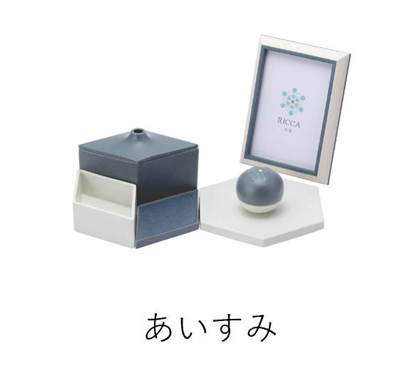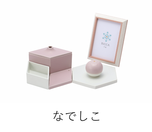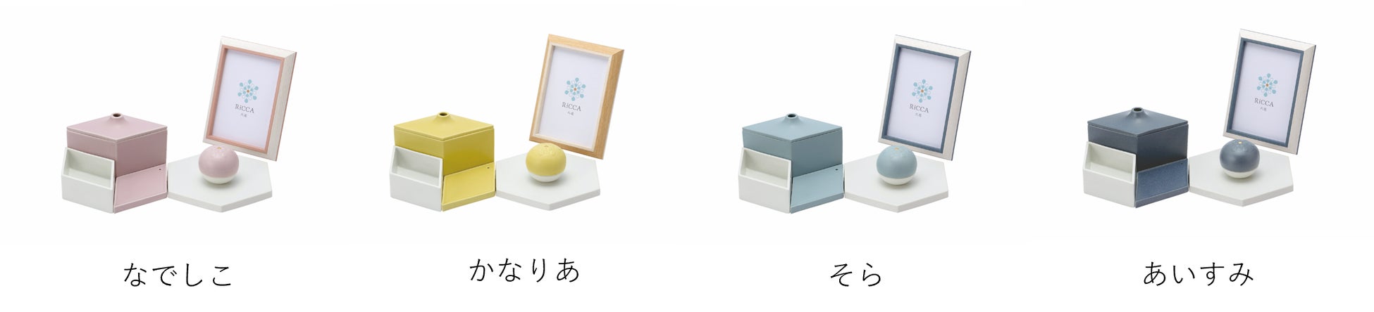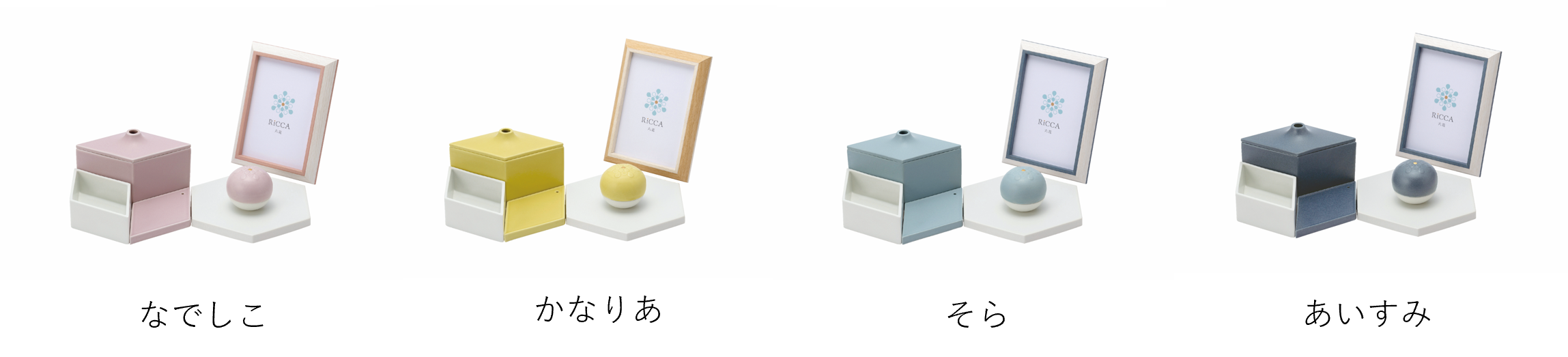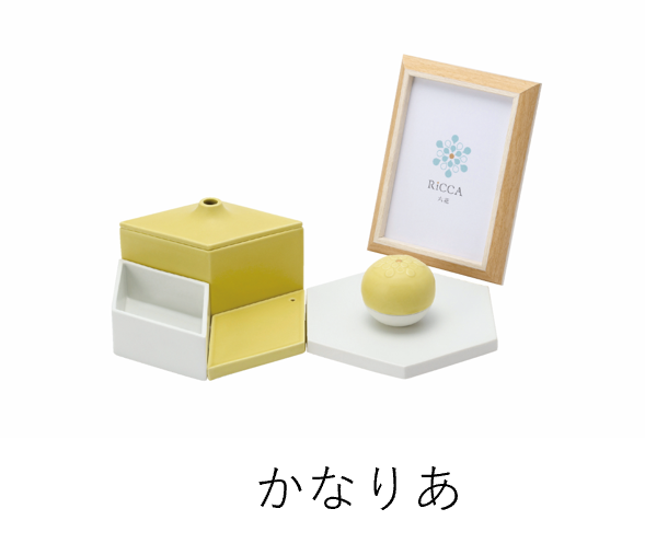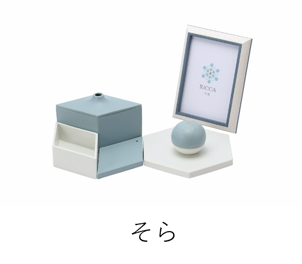 佐賀県嬉野市・備前吉田焼の花立・灯立・香立・ステージ・プチポット・フォトフレームの6点セットで、インテリアにもさりげなく馴染むナチュラルカラーの4色を展開。ひし形と六角形のプレートを組み合わせ、スペースに合わせて自由にレイアウトできます。大切な方の遺骨を納めるプチポットの天面には、「RiCCA 六花」のロゴの結晶のモチーフが入っています。供養商品に馴染みのない若い世代にも、日常に取り入れやすい商品です。故人のイメージにあったお色や、ご自身の気持ちの安らぐお色をお好みでお選びいただけます。