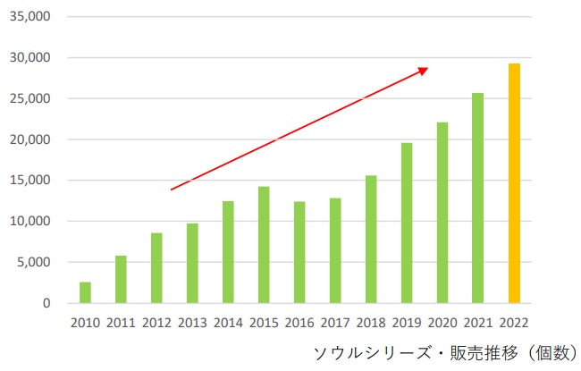 近年、核家族が増えたことにより、遠方でお墓参りに行く機会が少ない方や、住まいの欧風化からお仏壇を家に置かない家庭も増えてきました。こうしたライフスタイルの多様化により、「大切な人と離れがたい、見守っていてほしい」「思い出の場所に一緒に行きたい」「嫁ぎ先でも近くに感じていたい」など、従来のしきたりや宗教儀式にこだわらない“新しい供養の形”として「手元供養」への関心が高まっています。当社では「故人をいつも身近に感じたい」という想いに応え、「ソウルジュエリー」「ソウルプチポット」「ソウルステージ」の3ブランドからなる「ソウルシリーズ」約600種類を販売。累計販売個数は20万個を突破、2022年の販売実績はブランド設立当初の約12倍を記録しています。