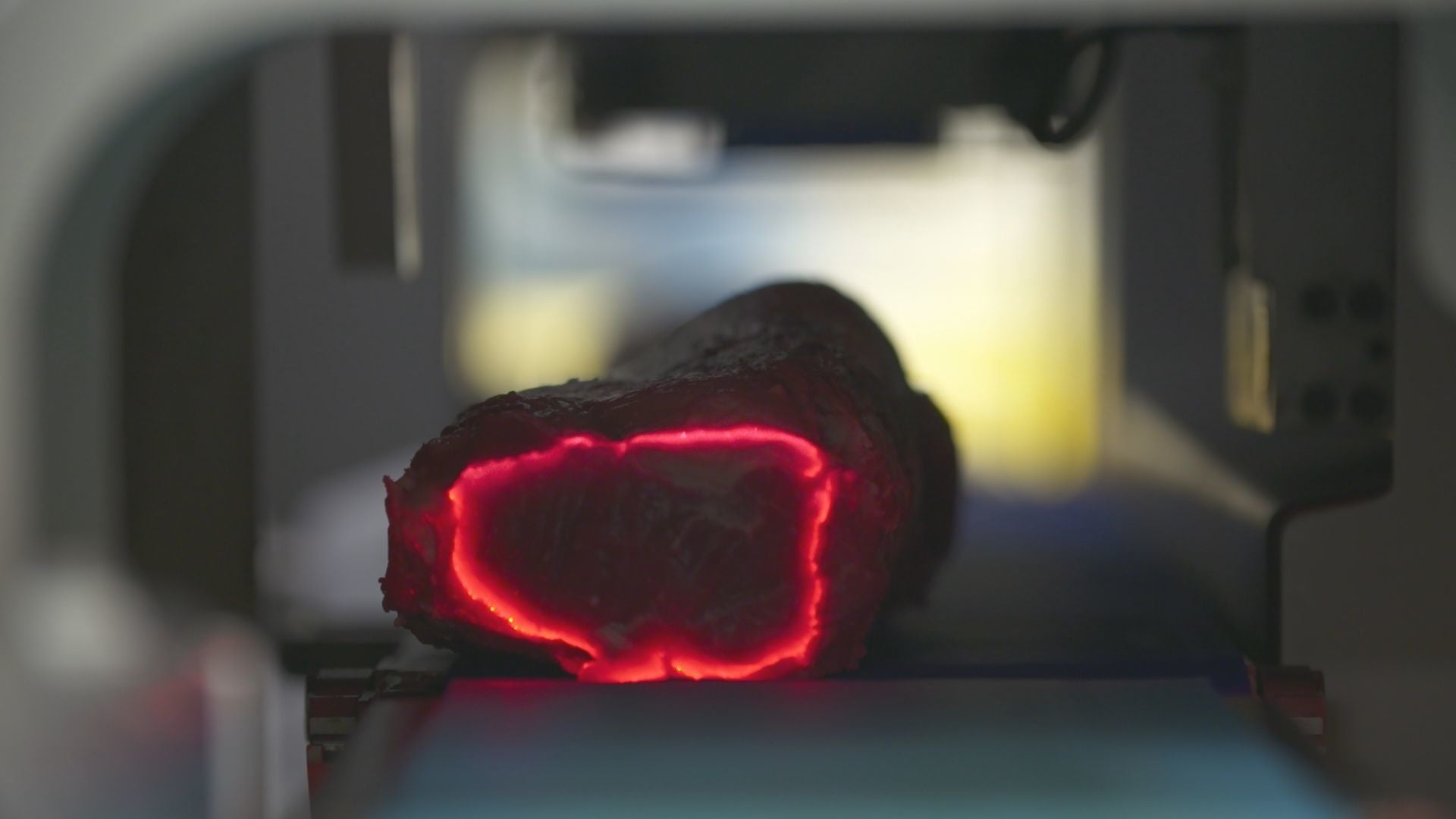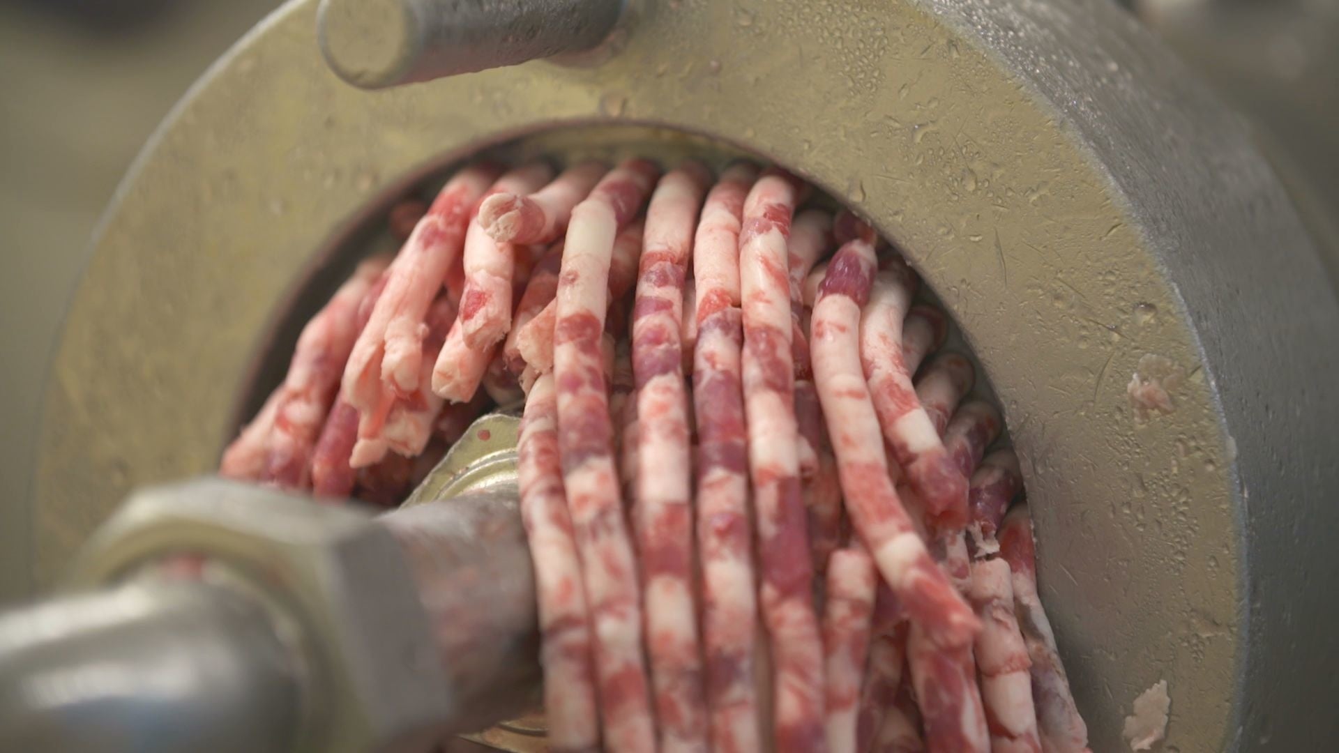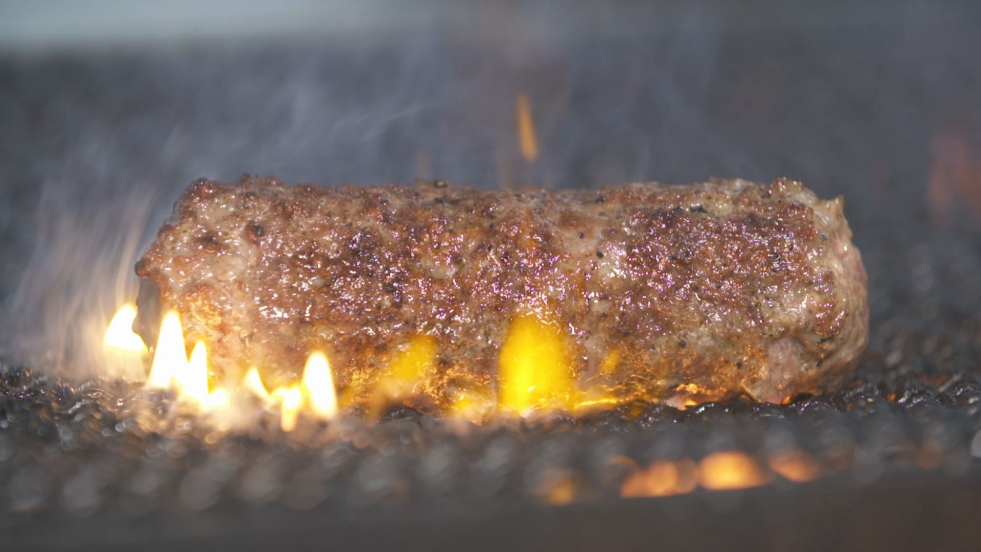 細長~い形が特徴の“炭焼き超粗挽きビーフハンバーグ”。肉肉しい食感はどうやって生み出されているのか?ハンバーグ専用マシンでは、極太のミンチ肉が滝のようにあふれ出す!この極太ミンチがおいしさのカギを握る。それだけではない。小麦粉などのつなぎをほとんど使わないヒミツの工程も大公開!