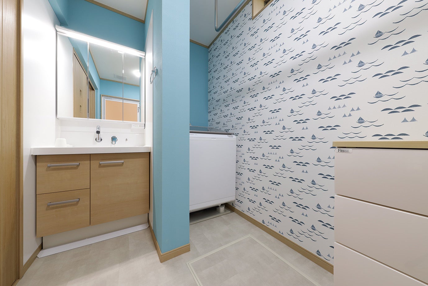 娘さんの夢であった、子どもたちと楽しく暮らすためのワクワク感のある家は、水まわりの壁色やクロスの柄など、住まいの様々なところで工夫されている。