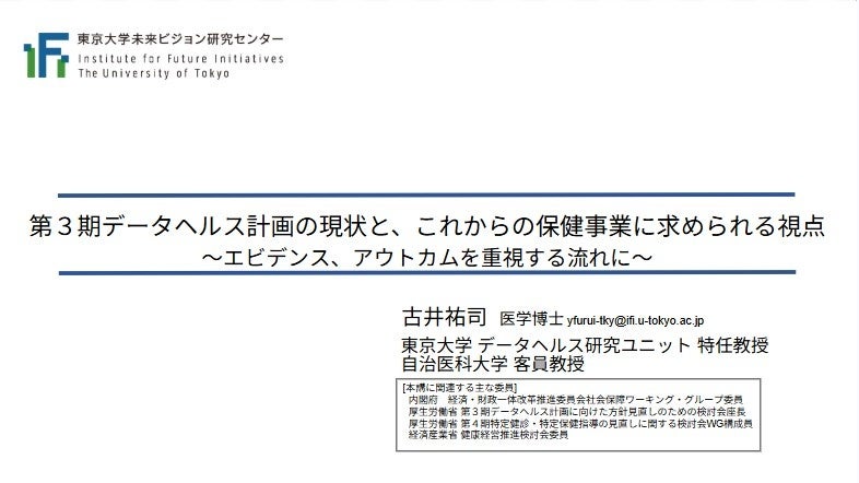 本セミナーでは、東京大学未来ビジョン研究センター データヘルス研究ユニット 特任教授/自治医科大学 客員教授である古井祐司先生がご登壇。「第3期データヘルス計画の現状と、これらの保健事業に求められる視点 ~エビデンス、アウトカムを重視する流れに~」と題してご講演いただきました。