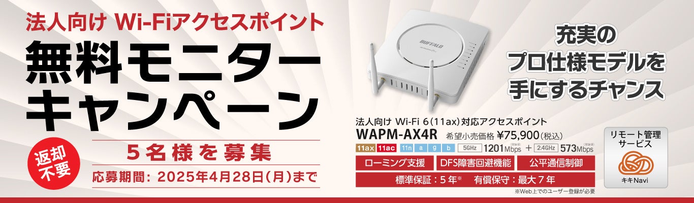 株式会社バッファロー(本社:東京都千代田区、代表取締役 社長執行役員CEO:牧 寛之)は、2025年4月9日(水)から4月28日(月)まで、5社様にWi-Fi 6対応 法人向けアクセスポイント「WAPM-AX4R」を無料で提供するモニターキャンペーンを開催いたします。
