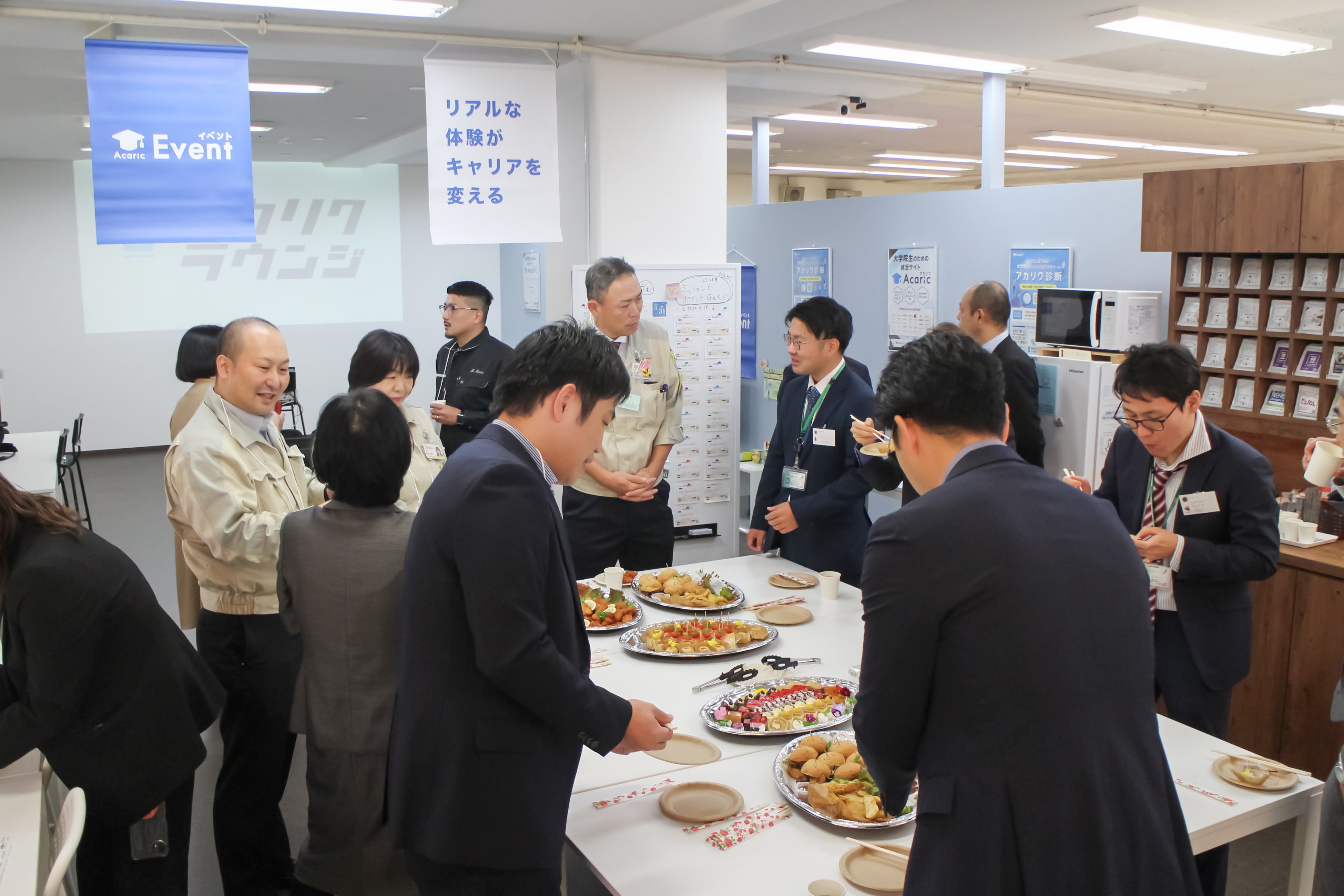 アカリクラウンジは、「地方でも就活イベントがもっと欲しい」という学生の声から生まれたラウンジスペースです。地方大学の学内(または隣接する施設内)に位置し、学生のキャリア形成のきっかけをつくる場として、アカリクが運営しています。ラウンジ内では、幅広いキャリアイベントが開催される他、アカリク会員向けにコーヒーやお菓子などが無料で提供されており、授業や研究のスキマ時間にくつろぎの空間として利用可能です。 広島大学(2024年11月)をはじめ、九州から東北地方まで、現在全国に6拠点を展開しています。