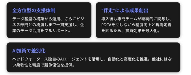 本サービスには、ヘッドウォータースならではの、以下の強みと差別化ポイントがあります。