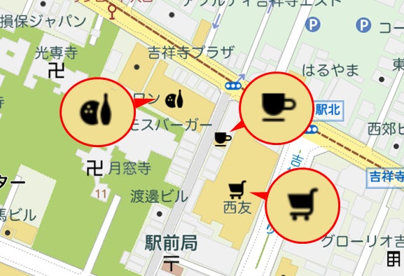 中縮尺時のスーパーやホテルなどの地図上のアイコンや、建物・施設名を大幅に増やします。アイコンは約4割を見直し、「スーパー」や「ボウリング場」など38種類を追加、変更します。建物名表記は、情報が密集した地域でも建物名の文字の折り返しなどを調整することで判読性や視認性を保っています。