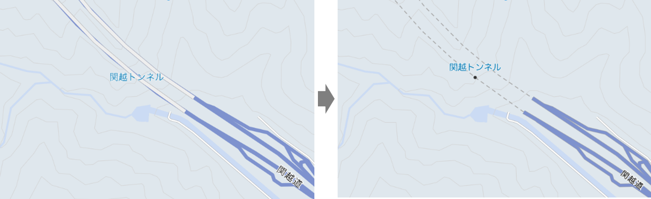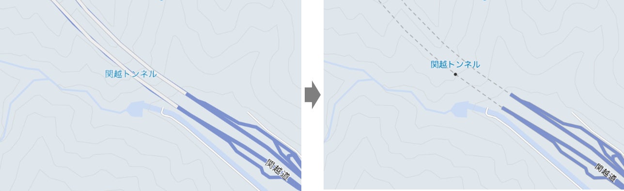 トンネルのデザインを変更します。これまでは道路の上にトンネルの表現を重ねる形で表記していましたが、今回トンネル単独の表現として点線を採用。通常の道路(高速道路・一般道など)との差別化を図ります。