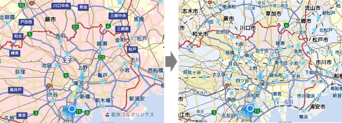 具体的には、中縮尺時における情報量を大幅に増やすため、地図上のアイコンや建物名の表示数を増やすほか、大縮尺で表示していた市区町村の色塗り分けと境界線表示を実施します。また、トンネルなどの表現も見直し、より見やすくなります。