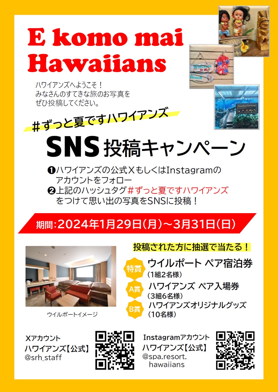 さらには、当キャンペーンにあわせ、SNSでのプレゼントキャンペーンも実施いたします。ハワイアンズ来館時に撮影した写真を、SNSに投稿した方を対象に、今年10月に25周年を迎えるウイルポートのペア宿泊券やハワイアンズのペア入場券などを抽選でプレゼントいたします。
