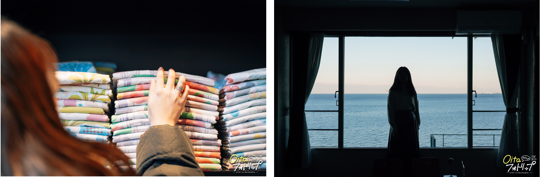 右:客室から望む別府湾。室内と人物を暗くすることで、暮れなずむ別府湾の優しい表情を感じる1枚。